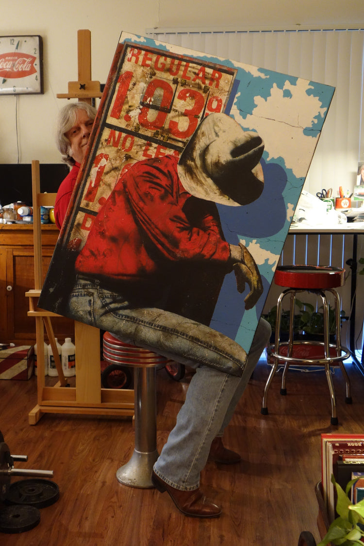 Middlekauff focuses on what cowboys do when “they’re not chasing cows.” Perched on fences, playing with a yo-yo or eating M&Ms, wearing dust-covered jeans and boots, their hats at an angle. With or without the cowboy, he paints old toys, vintage license plates, cars and truck, neon signs by vacant motels and cafes, classic billboards … “as long as they’re old and weathered, or full of colors and textures.” By combining the past with the present, putting things together that don't necessarily appear together (but they could), and by adding touches of humor, nostalgia, and sometimes sentimentality, Middlekauff reveals his unique vision of America. “I do my artwork for the love of it, for the fun of it, and to share what I see and feel. Like Norman Rockwell, one of my heroes, I want others to experience the things of our culture, and of days gone by, but in a fresh and unusual way.”