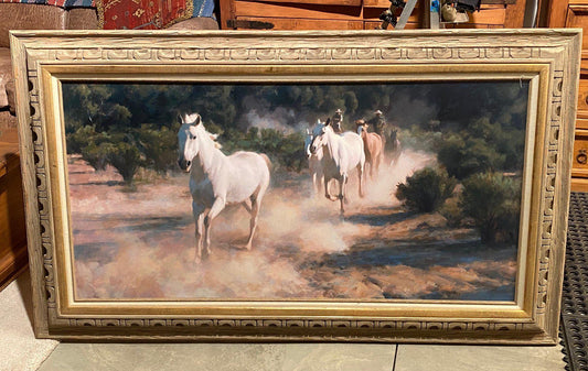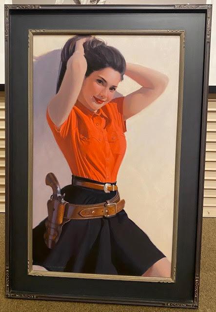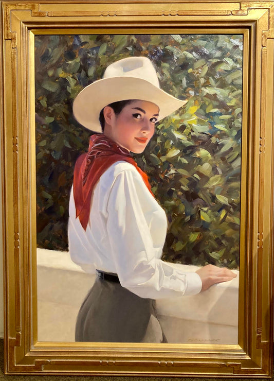 Working exclusively in oils, Mummert’s vision of the American West is filled with images of cowgirls and cowboys, snap shirts and fringed gloves, boots and hats. His scenes often resemble a vintage magazine cover from the 1930s. All of his paintings are the result of hours and hours of historical research, scouting locations, clothing and models, determining the correct time of day for lighting, and more. At times he places his subjects in a detailed landscape or cafe, at other times they can be seen against washes of color or vintage styled wallpaper.