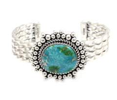 The Yellowhorse jewelry trademark "Rising Sun" design is one of their most popular collections with its round or oval-domed center surrounded by small 'drops' or beads of silver – each one made by hand.