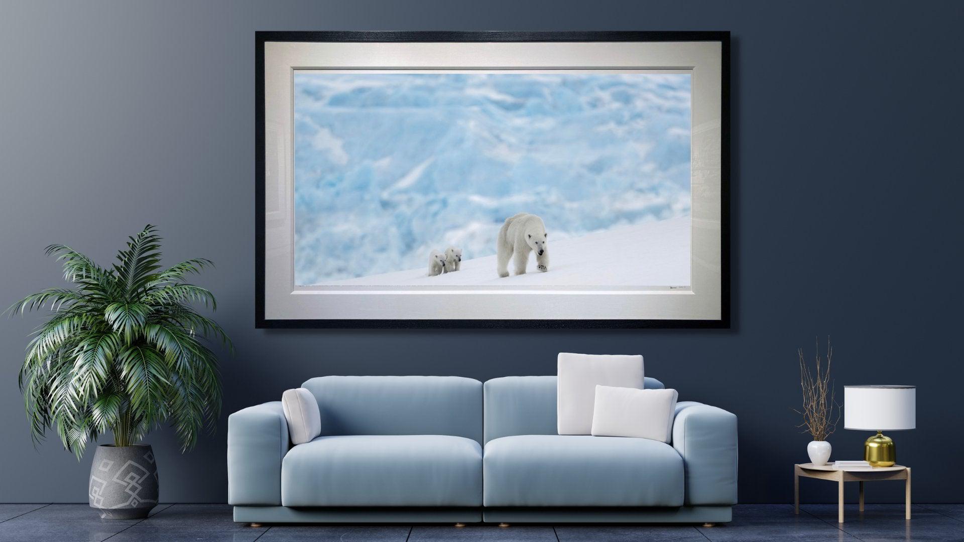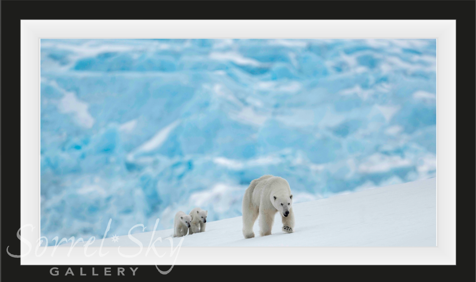 This moment in time, taken at about 80 degrees north in Svalbard, tells a happy story and is made all the more profound as a result. I have never had the chance to take a photograph like this before; two newly born polar bear cubs travelling in unison with their mum through the very environment that defines them - glacial ice, mountains and snow.