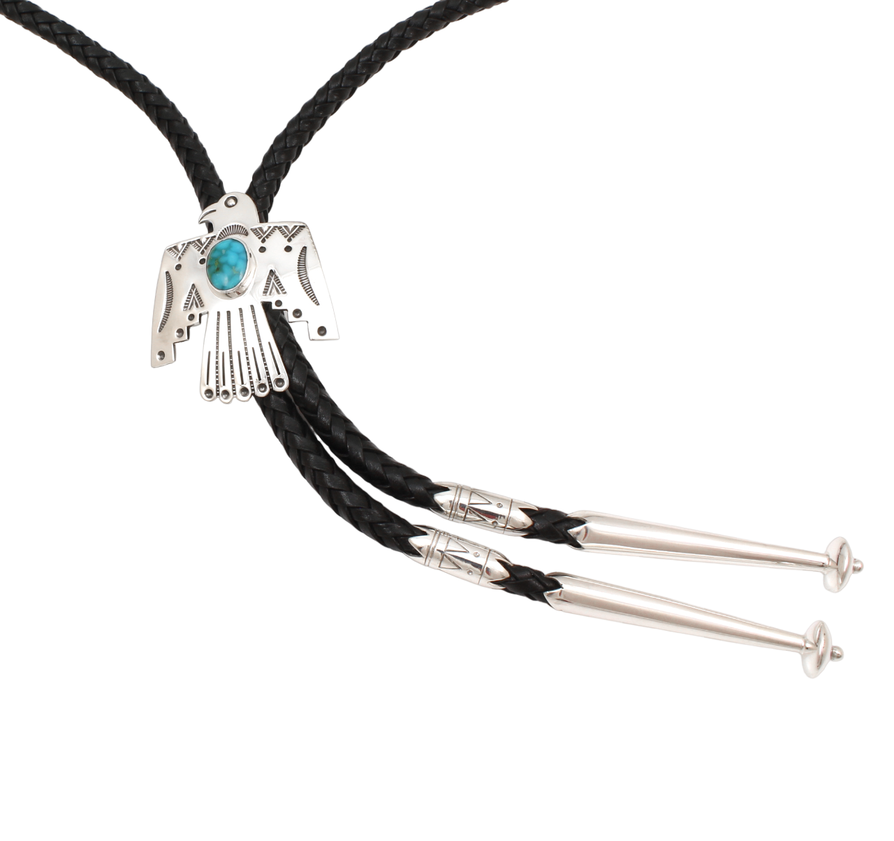Sterling silver with high grade Kingman turquoise, 2" x 1 3/4", 46" leather cord, silver tips