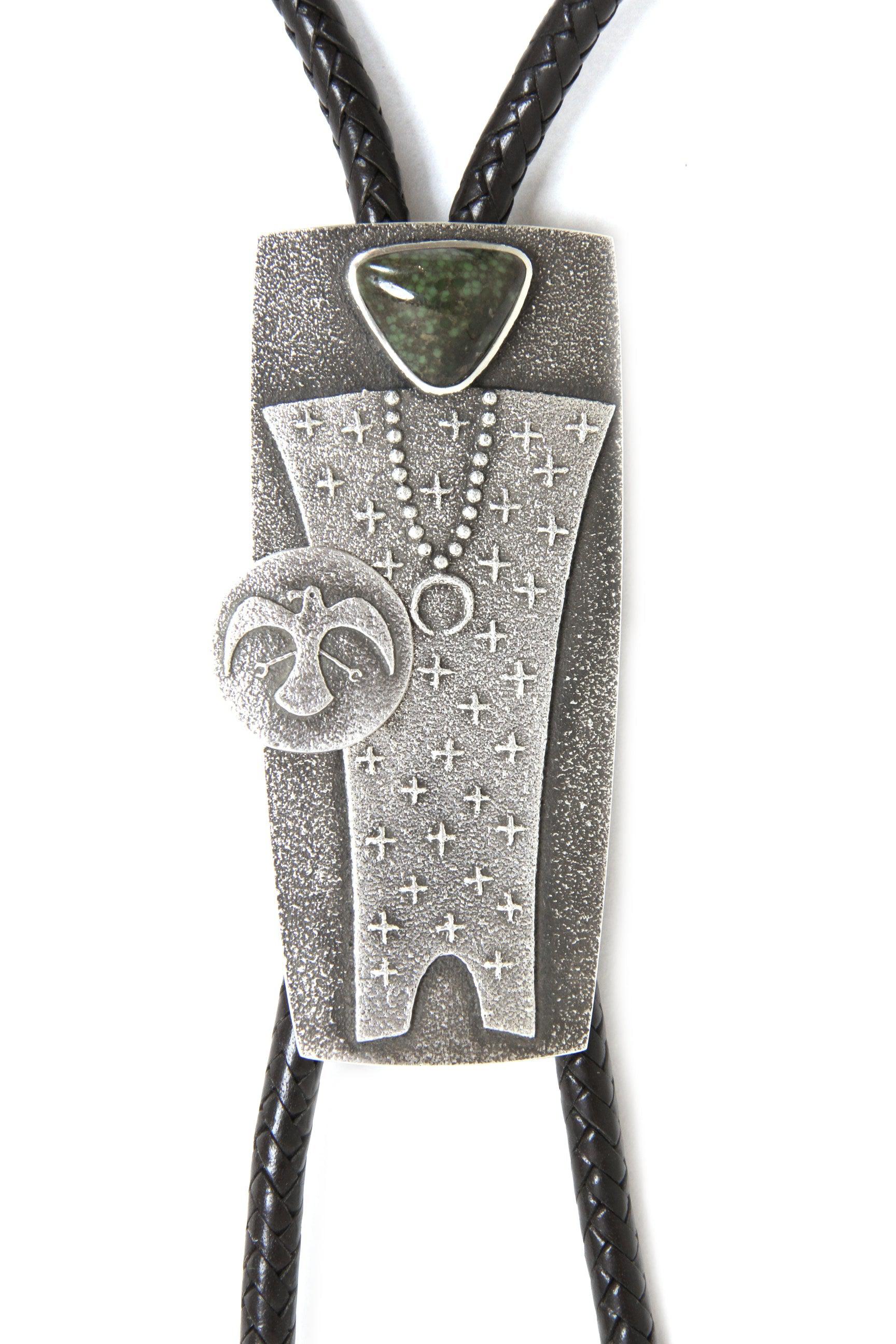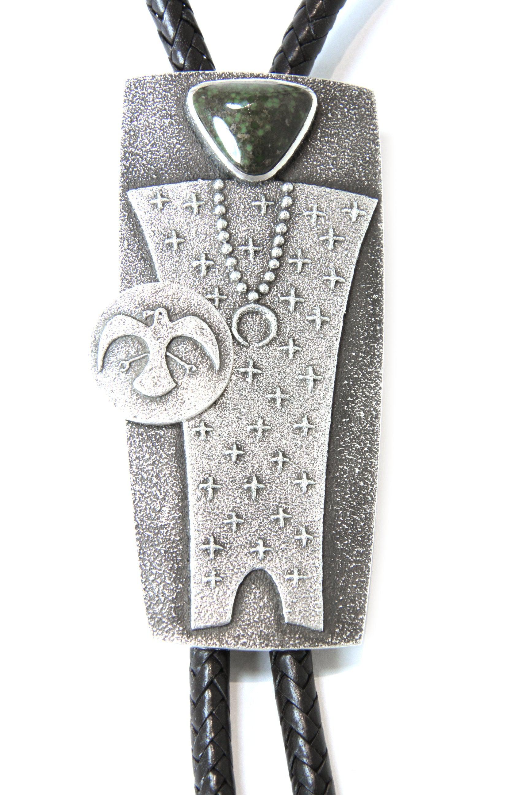 Sterling silver bolo with Damale turquoise and leather cord. 4 1/4" x 2" bolo with 46" cord