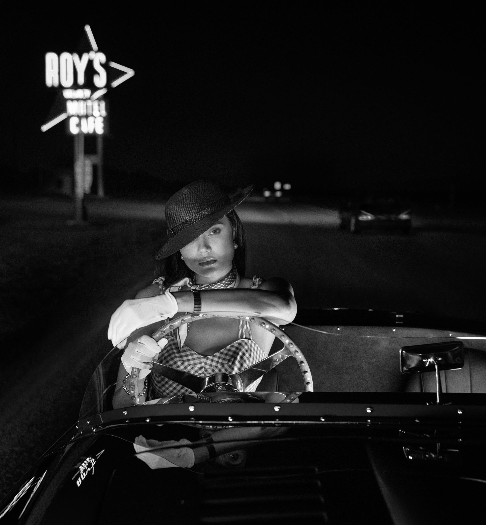 Our model that evening, in the remote Californian desert, was Daniela Braga, who is both beautiful and theatrical. We styled her to the era and I just told her to look free, dreaming of her new life in California as she drove. Afterall, at this point, she was only four hours from Los Angeles.