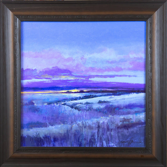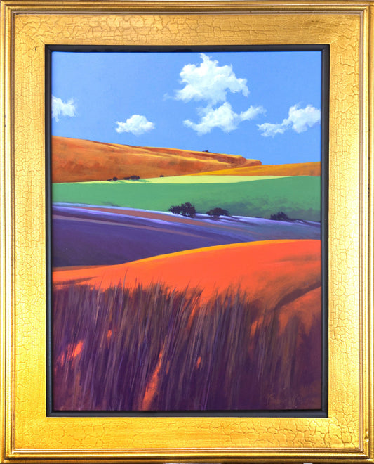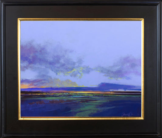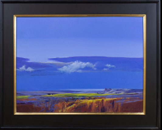 As a boy, Lee spent a lot of time outside hiking, and later, countless hours driving around the Southwest with his eyes on the mountains and clouds. With this expanse of sky and distant horizons “baked into” him, and possessing a sense of place that is hugely important to him, he now prefers the studio to wide-open spaces. “None of my landscapes are of real places-other than that they must be close by where my shamans live. Call them “unearned memories” that live within me and come to life only when I paint.”