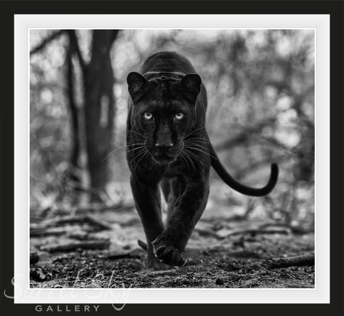 The charred canvas offered a conceptual opportunity, with the scorched earth littered with blackened wood. It was a bleak, apocalyptical scene. Acclaimed conservationist, Kevin Richardson, cares for a handful of black panthers very close to this area and I recognised an opportunity to do something a little different. Black on black.