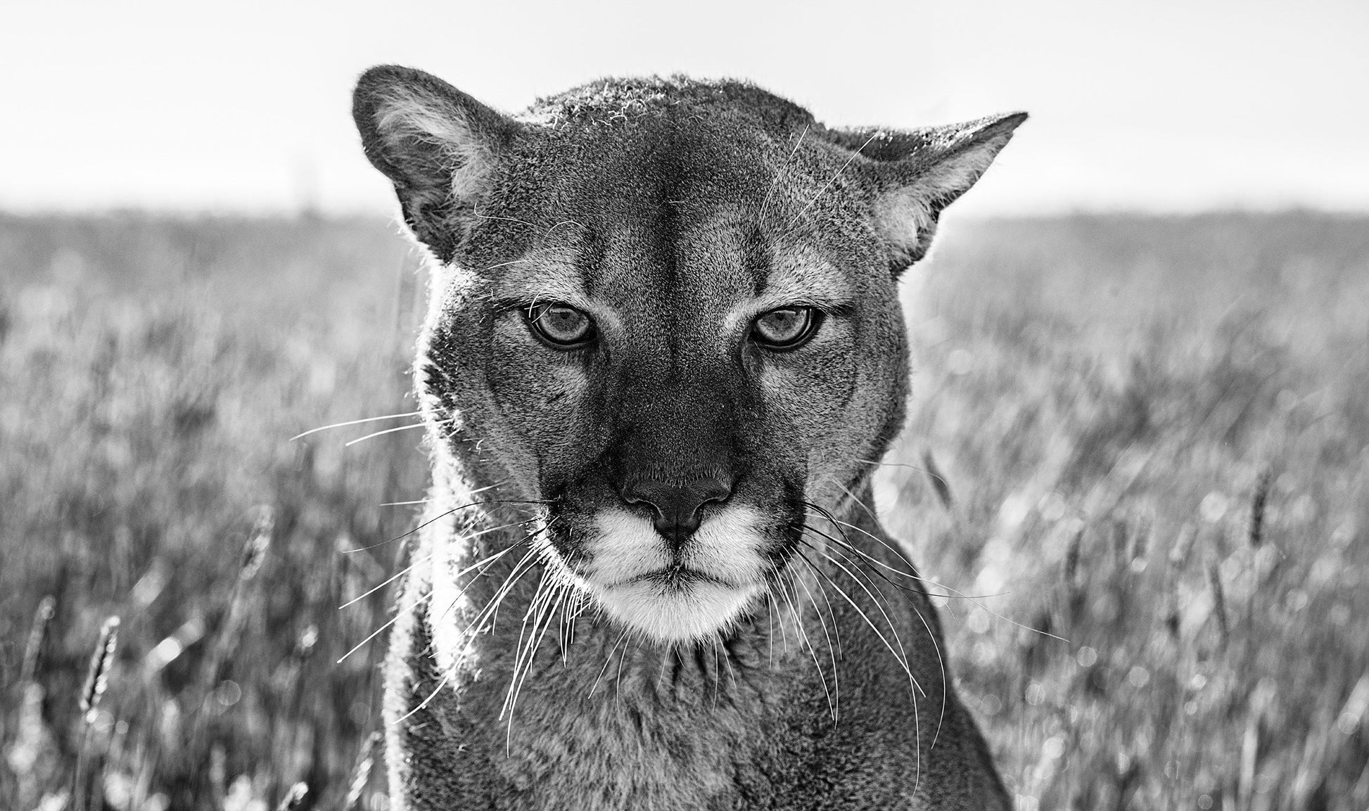 It is not an authentic wildlife photograph and makes no claims to be so. I started with a preconception of what I wanted to achieve - an intimate portrait of an aggressive cougar and worked backwards from there. Ideally, I wanted a degree of facial detail that would normally only be attained in a studio with a tame mountain lion. The hills in North East Montana are a long way from any studio, but the mountain lion largely responded to his carer and that offered the opportunity.