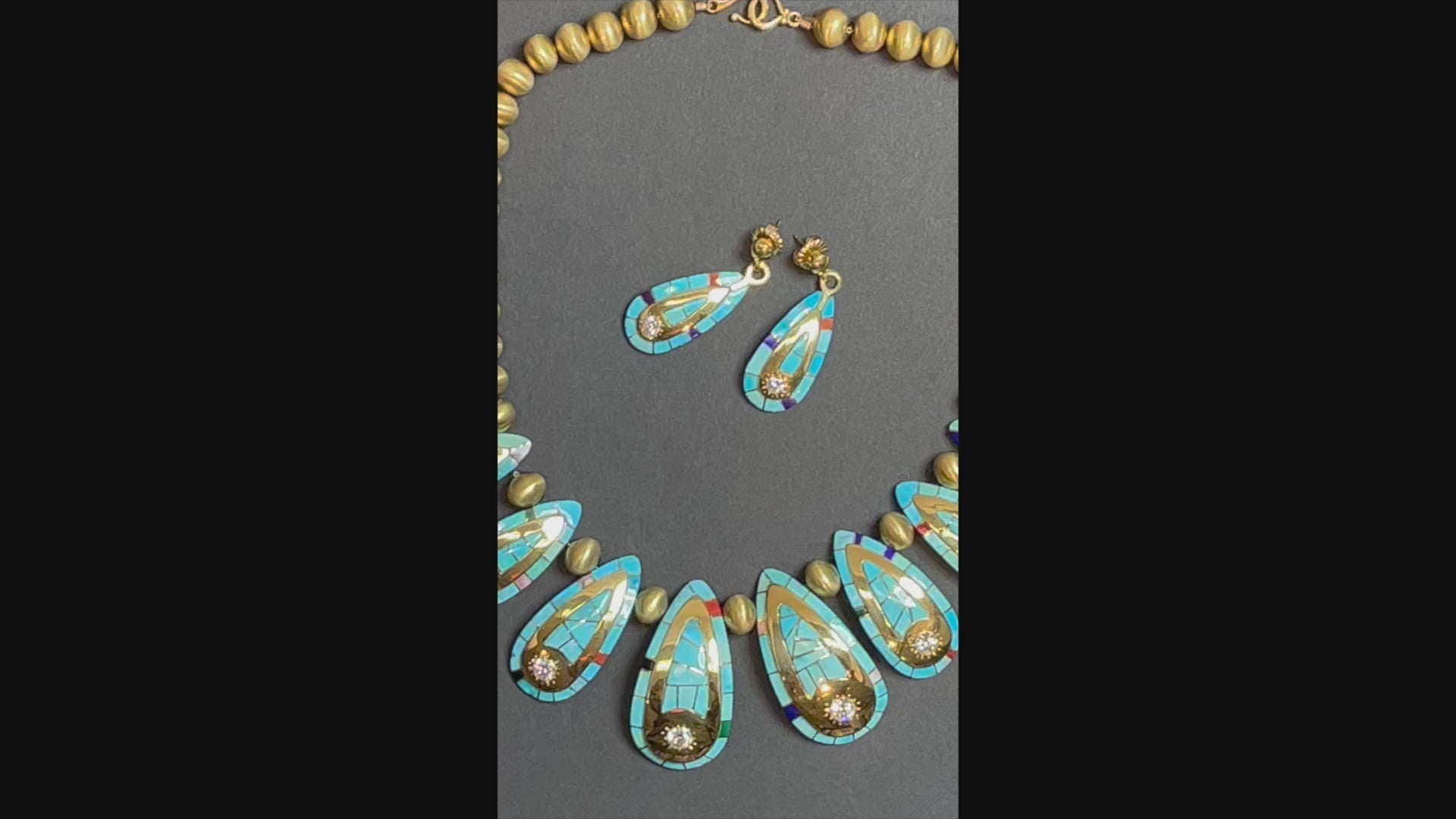 18K Gold (11.46 oz) necklace with 5.14cttw of VS2 G-H Brilliant Cut Diamonds ranging from 1/3ctw to 1ctw center diamonds, featuring handmade 18K beads with satin finish on a handmade chain. Inlaid with Sleeping beauty turquoise and flecks of lapis, coral, opal, black onyx and malachite.