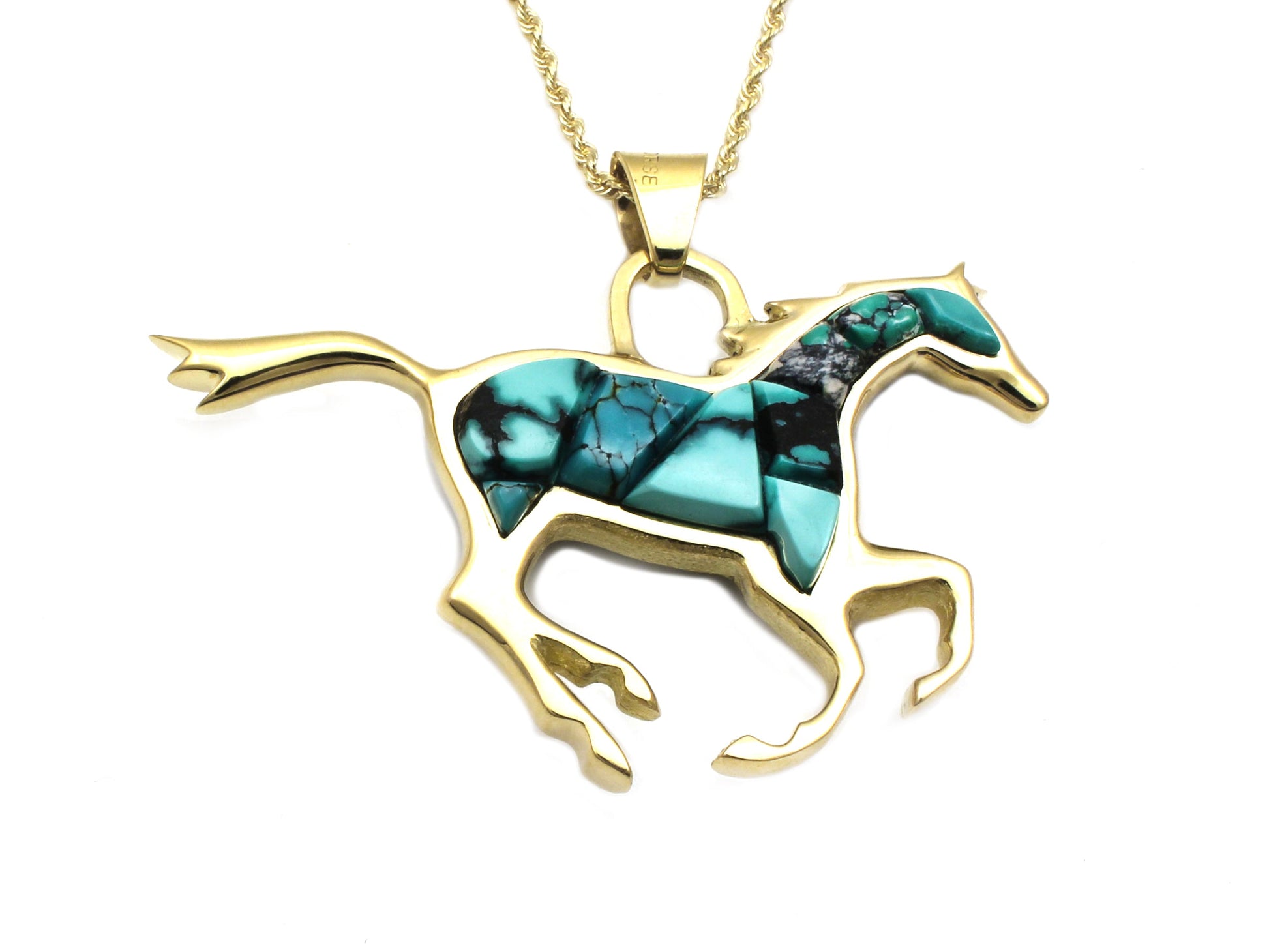 A Nighthorse classic in rich 18kt yellow gold. This reversible pendant features turquoise on one side and sugilite on the other. Ben once raised quarter horses, including one AQHA Supreme Champion.