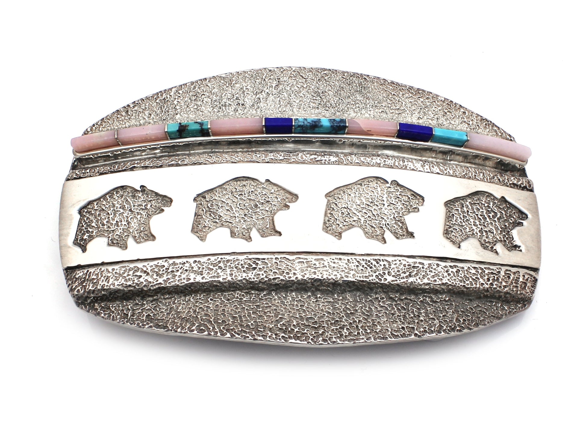 Ben Nighthorse’s popular bear design is seen here with Pink Opal, Turquoise and Lapis. Sterling silver.