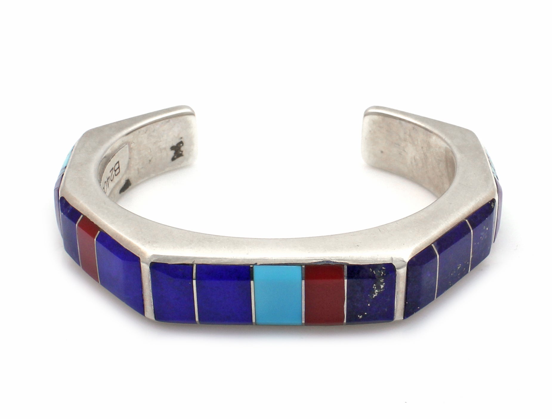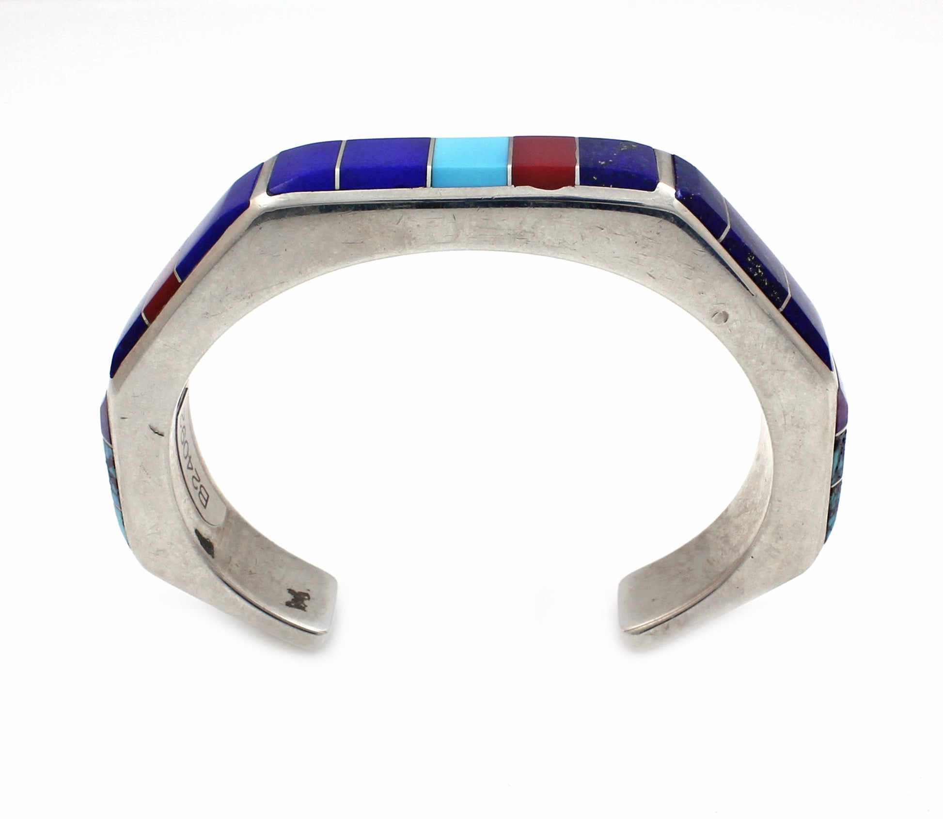 This stunning box angle bracelet by Nighthorse features lapis, turquoise, charoite, and rosarita in sterling silver.