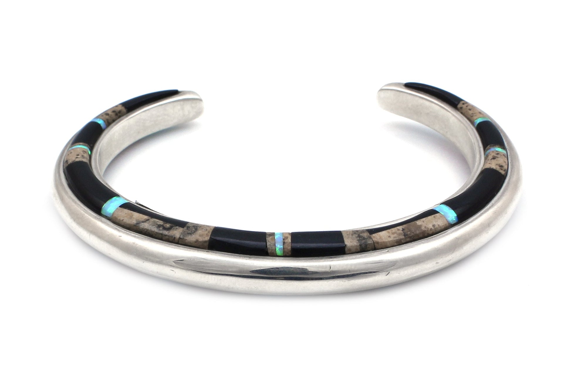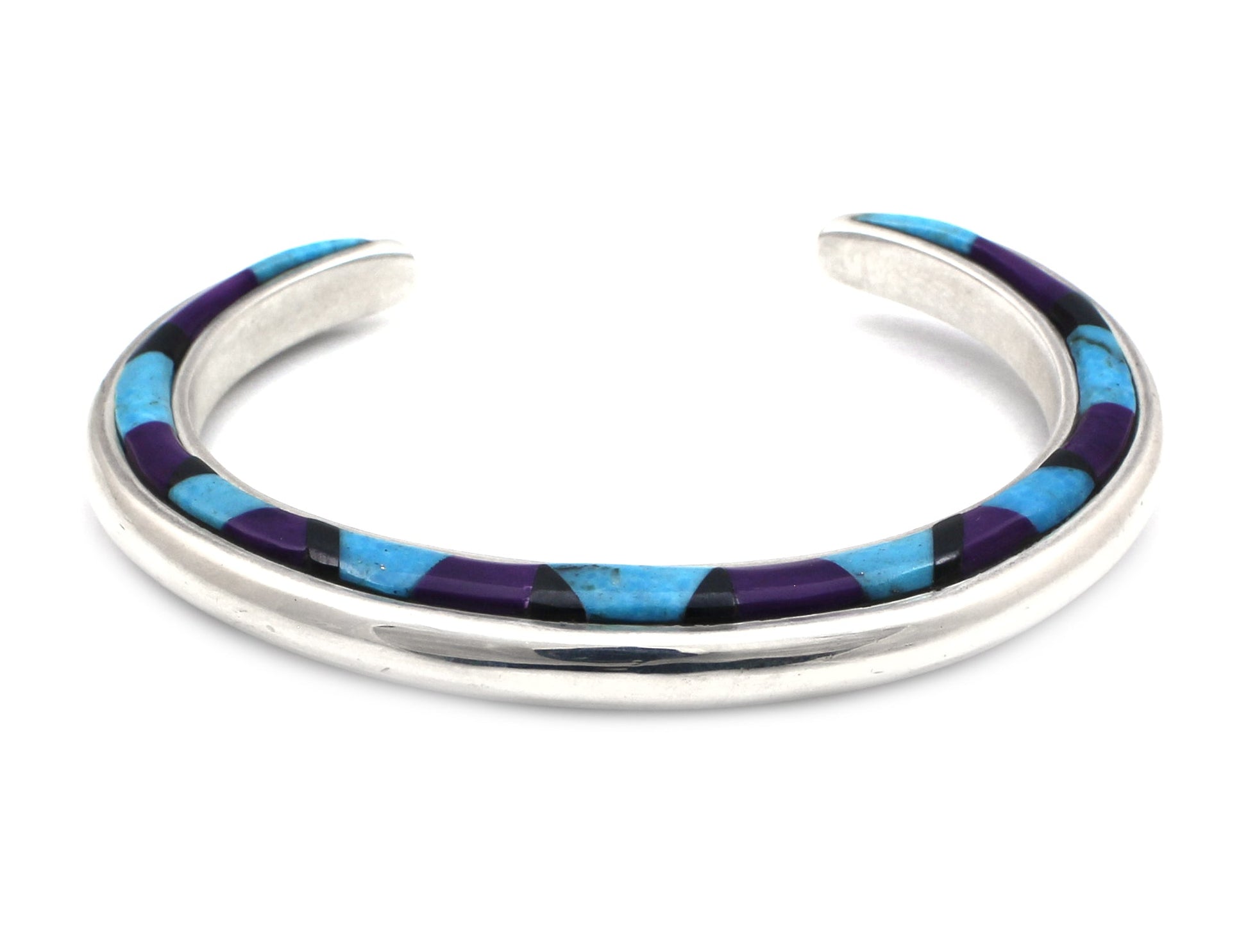 A new reversible bracelet by Ben Nighthorse. The Side Inlay cuff bracelet features an intricate inlay of turquoise, sugilite and onyx on one side and onyx, jasper and opal on the other. Size: 6 1/2”