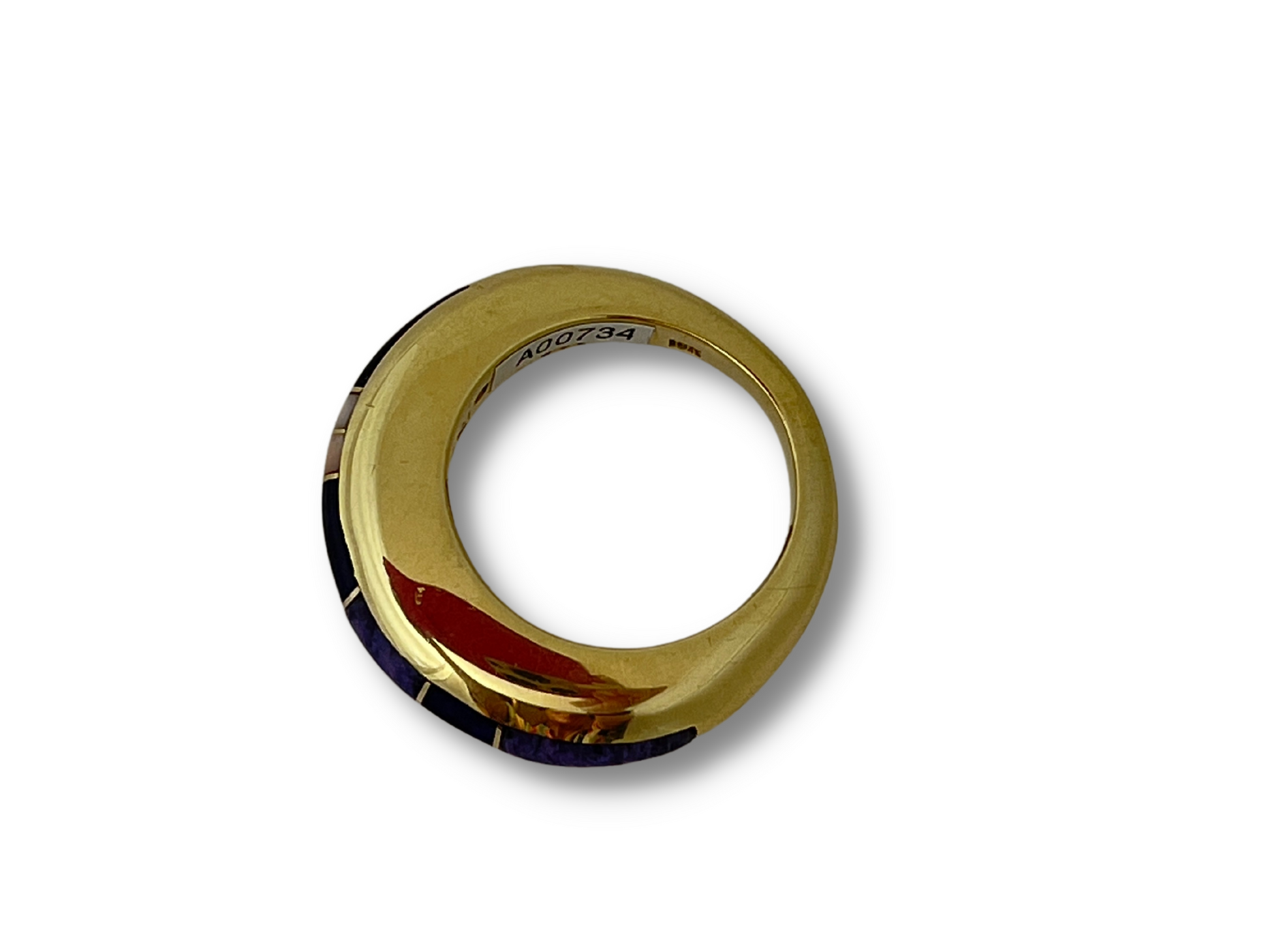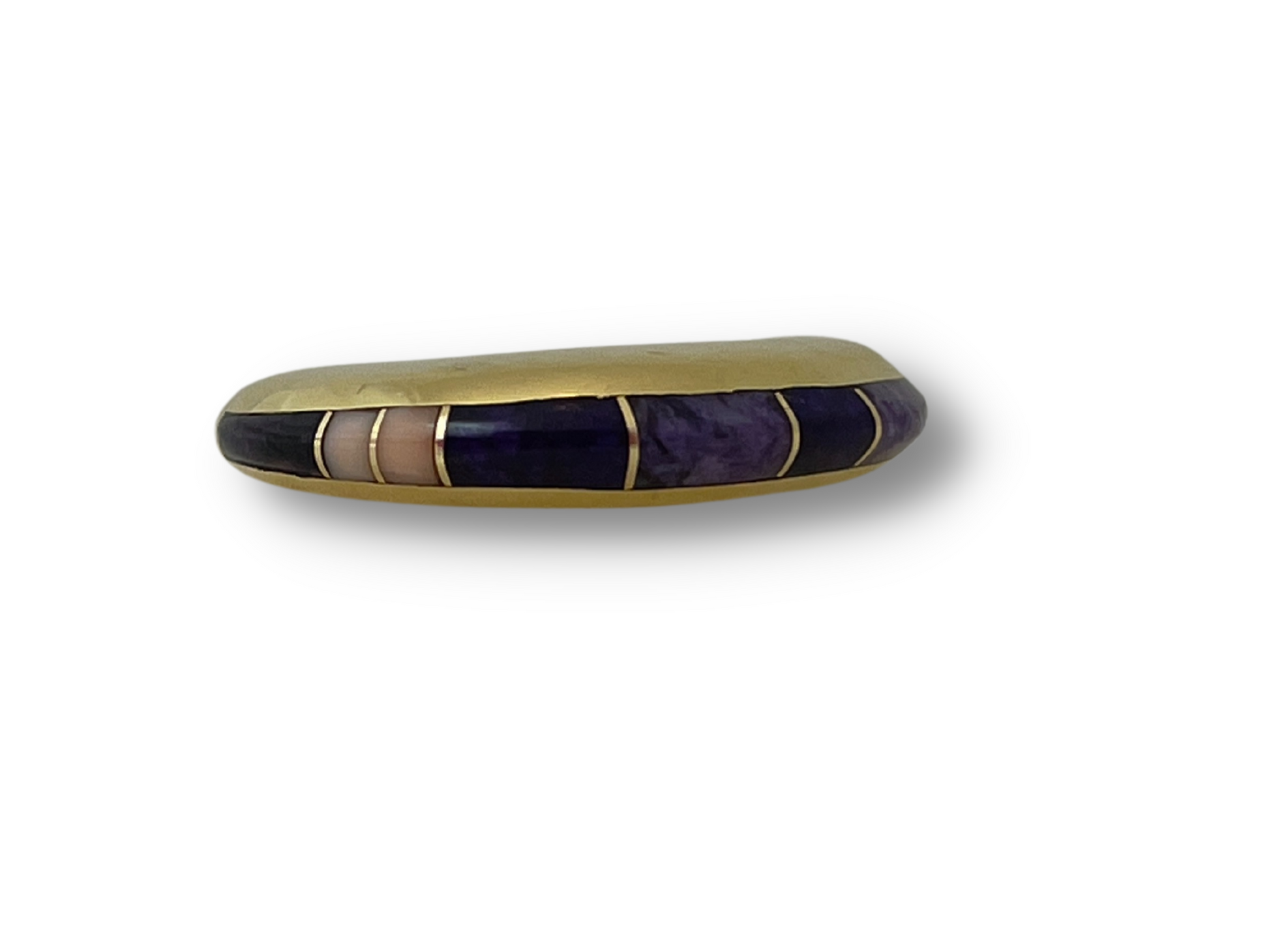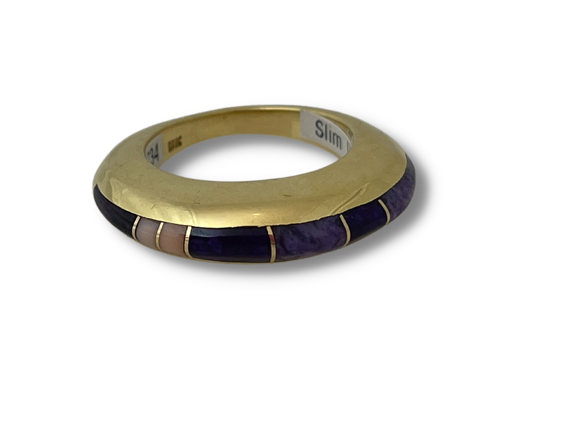 18kt gold set with sugilite, pink coral, charolite, onyx and lapis. Size 7 1/4.