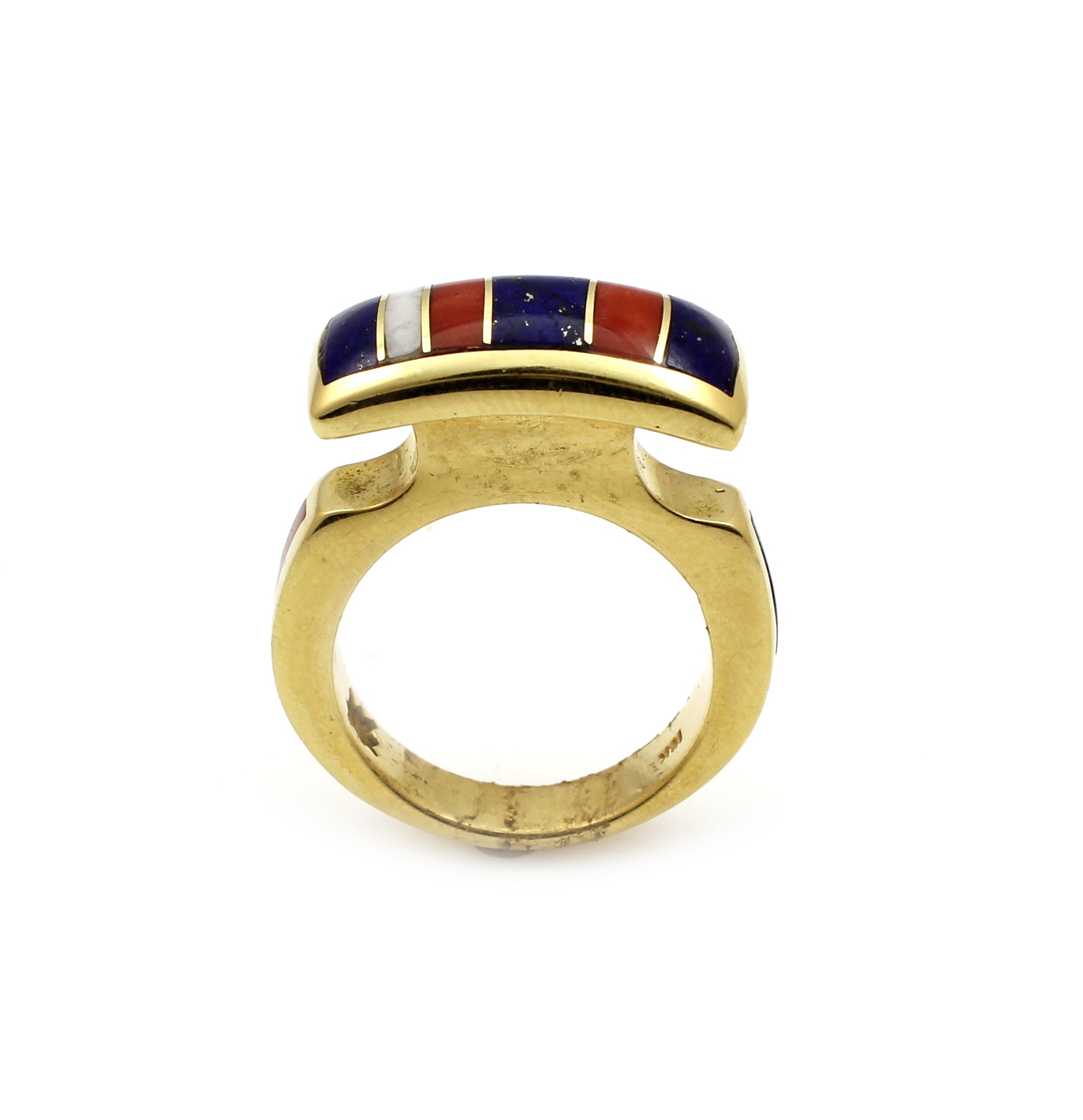 18kt gold set with lapis, coral, and white onyx. Size 6 3/4.