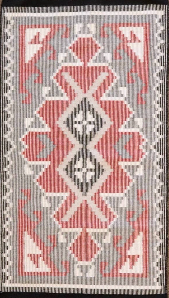 The Coal Mine Mesa weavings originated at the trading post of that name near Tuba City, Arizona. The weaving got its second name, “Raised Outline”from the fact that the designs were made by alternating different colors of weft yarn and at the end of a color run the weft thread was transported back over two warp threads producing a raised edge to the pattern.