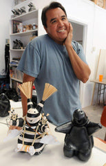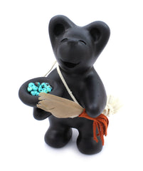 All of his characters are well-known for their cheerful, animated expressions. The turtle, his primary subject, is considered the Choctaw story keepers and storytellers, shielding and protecting narratives under its shell until it is ready to share them. The storytellers are coiled-built and then finished with hand-burnishing. The bears represent the male facet of the tribe with their strength and courage. Like the turtle storytellers, the bears are also hand-built, but wet-sanded to add a high sheen.