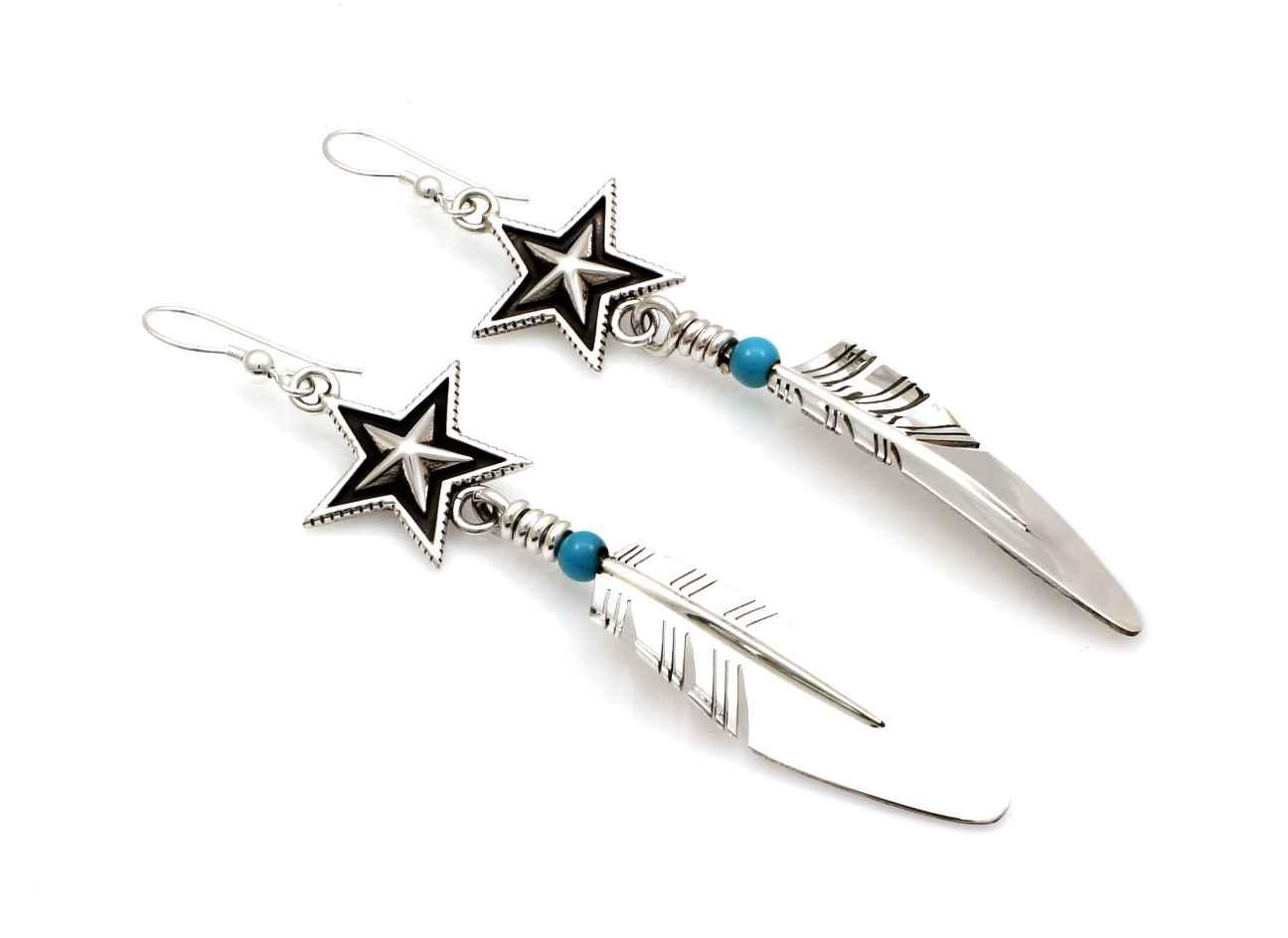 2 3/4" long sterling silver earrings with star/feather design and various beads