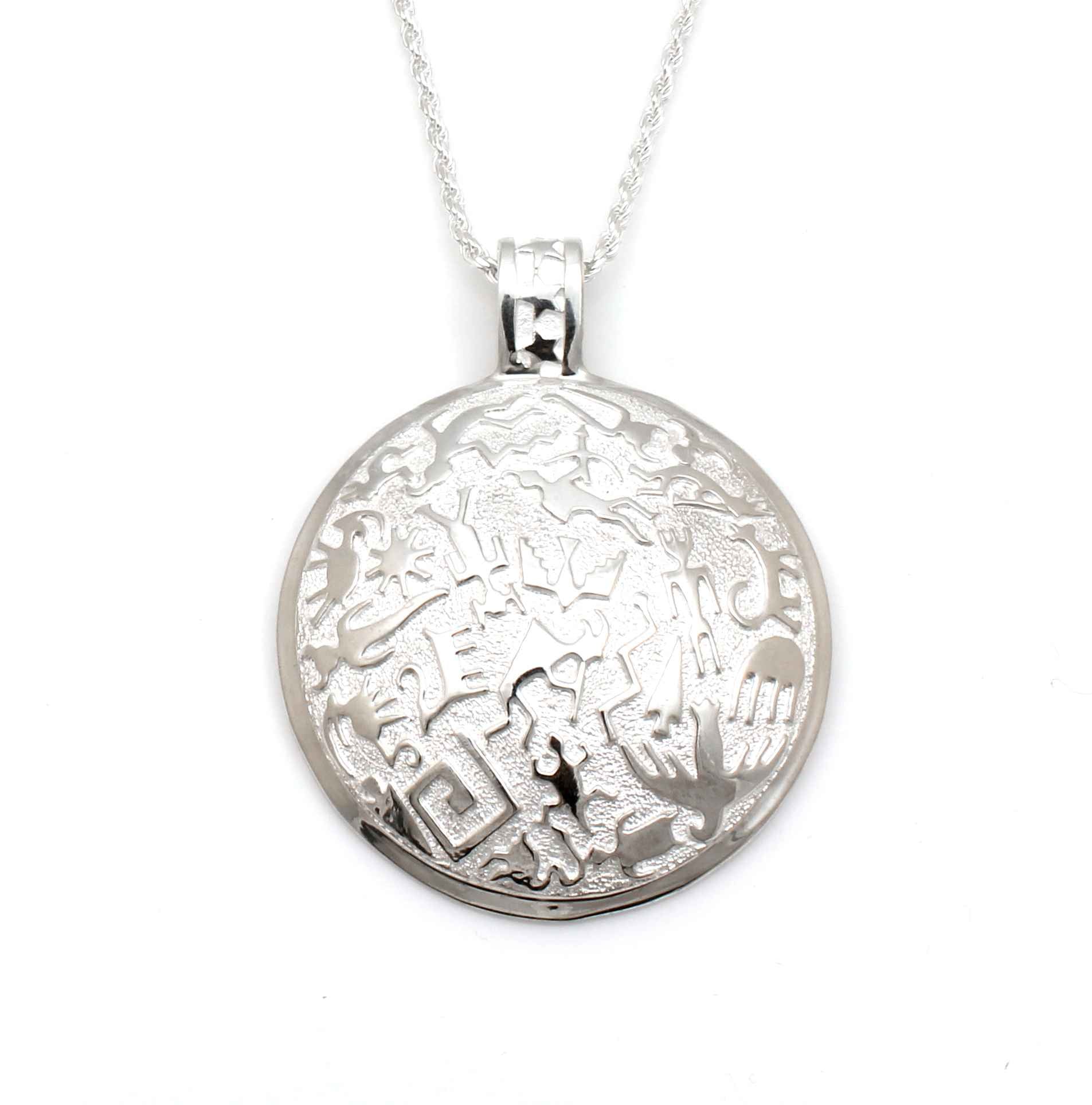 Inspired by the petroglyphs of the Southwest, Ben Nighthorse’s rock art design is a modern classic. Seen here in sterling silver, white sandblasted finish. Chain included. 2.5” wide
