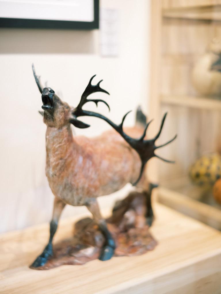 In rock graphics depicted by Stone Age Man we find a legacy, which belongs to all mankind. They are found virtually on every continent. Some experts believe the animal imagery was done as a way of establishing a supernatural connection with the game early man hunted for his survival.Most of the animal forms painted on cave walls during the Ice Age are believed to be iconographic, with mythological implications. Once in a while, however, an image will appear that is so powerful it would seem to represent a force of nature, and at the same time is rendered with such personality that it might also be the portrait of an individual.?There is a rather simple line drawing of a caribou head, neck, and crazy antlers that is in the extensive caverns at Lascaux. It has always been one of my favorite drawings from that period, so I decided to expand on the image by completing the body three dimensionally, and having it bursting from the rock, coming to vibrant life. Bronze, 29 x 15.25 x 17.5" Edition of 35 Display steel stand available for $2400