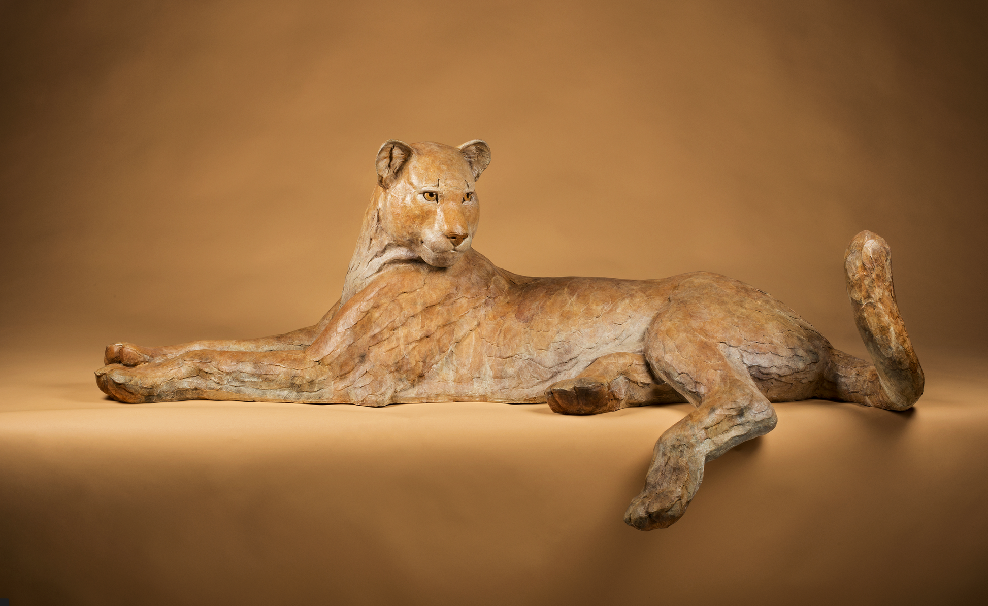 Since her childhood, York has been drawn to the animal kingdom. She is interested in portraying a sense of individual character and personality in each of her animal sculptures. Bronze, edition no. 7/10. 22” x 67” x 25”. Weight: 145lb.