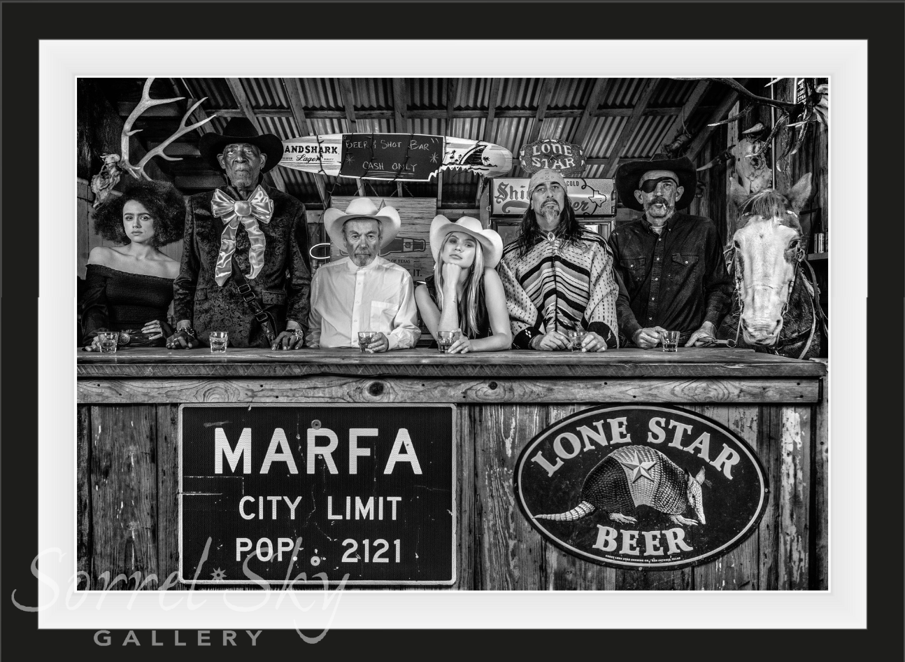 The outdoor bar at The Lost Horse Saloon in Marfa, West Texas, is just how I hoped an outdoor bar, in traditional cowboy country, would look like - a mishmash of wood, corrugated iron, weaponry, stuffed animals and beer merchandise. My preference is that these bars should be cluttered and deeply individualistic - there are no formulas in West Texas other than in the Crystal Meth motorhomes. On our scouting, I was immediately drawn to the sign on the front of the bar which located the destination in the most authoritative of ways.