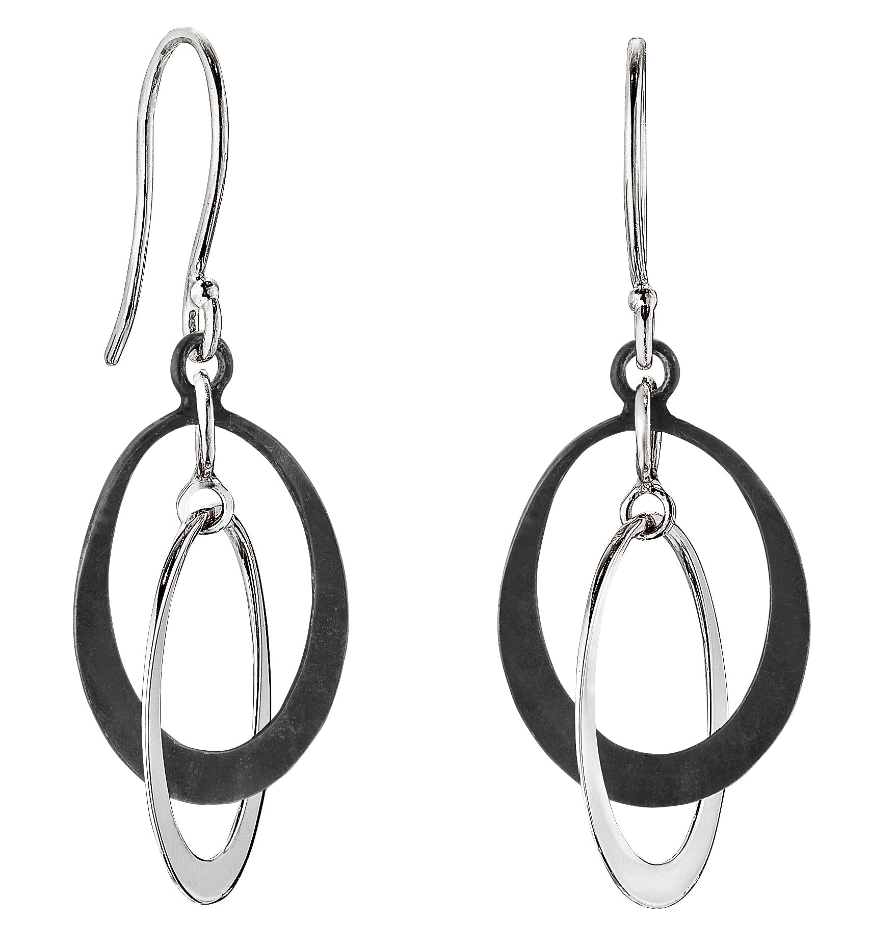 Two 13mm oval hoops in bright and matte black sterling silver, interlocked on shepherd hooks. 1 1/4" long