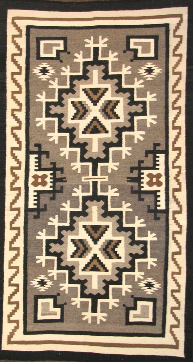 The weavings from this area are often referred to as the Cadillac of Navajo weaving. The two traders, Ed Davies from Two Grey Hills and George Bloomfield from nearby Toadlena, adopted many of the styles from JB Moore’s patterns but encouraged the use of all-natural colored wool in the rugs they bought.