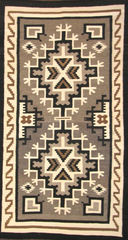The blending of the natural brown, grey, white and black wool created a pleasing palette and, because the traders paid more for quality, the designs and weaving became finer and more intricate. The Two Grey Hills area was famous for creating the “Tapestry” quality weaving (over 80 weft threads to the inch) and Daisy Tauglechee, who wove pieces in excess of 120 wefts per inch, is considered to have been the finest Navajo weaver. It was because this weaving area that the Navajo rug began to take its place on the walls of American homes and was first recognized as fine art.