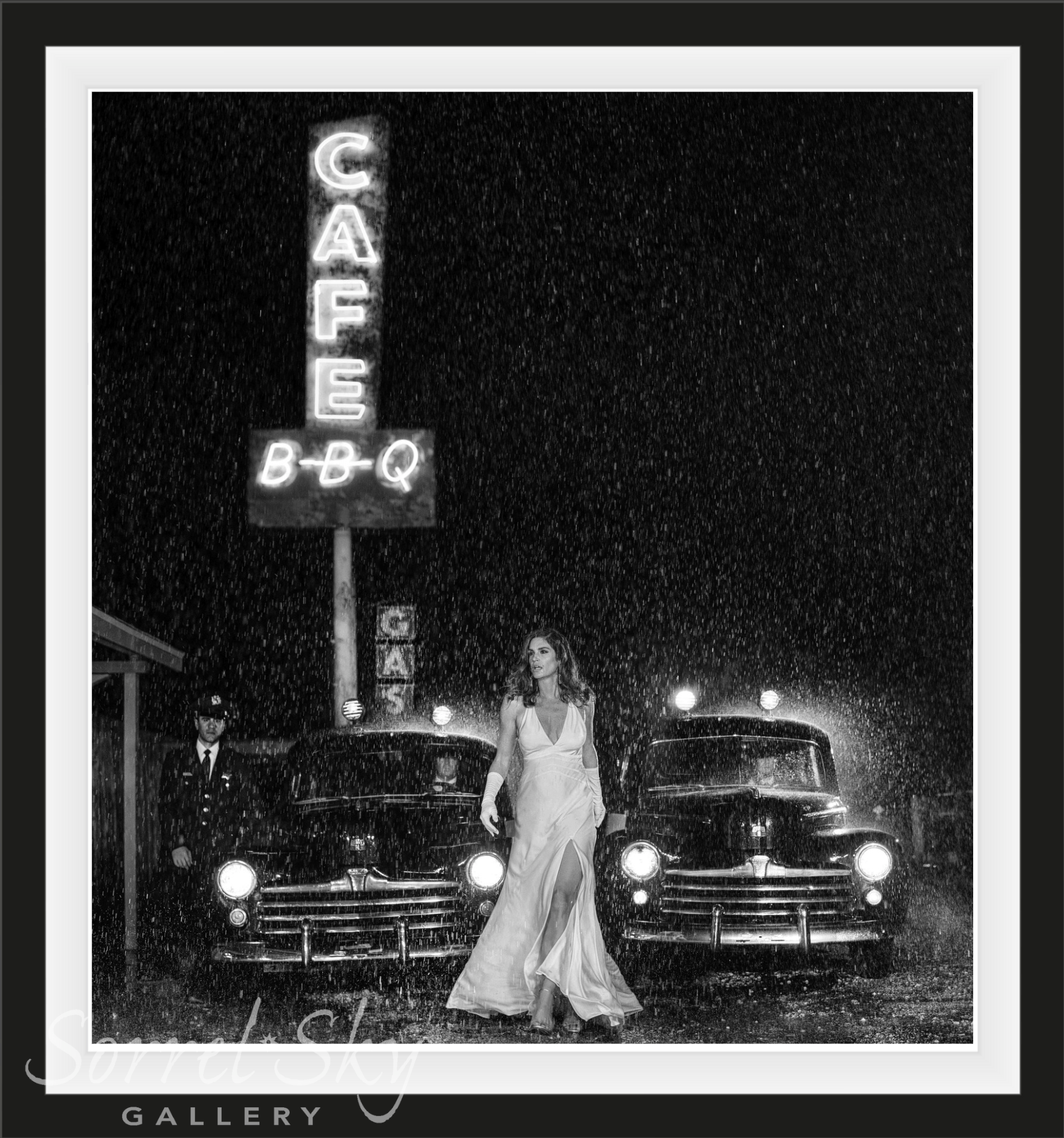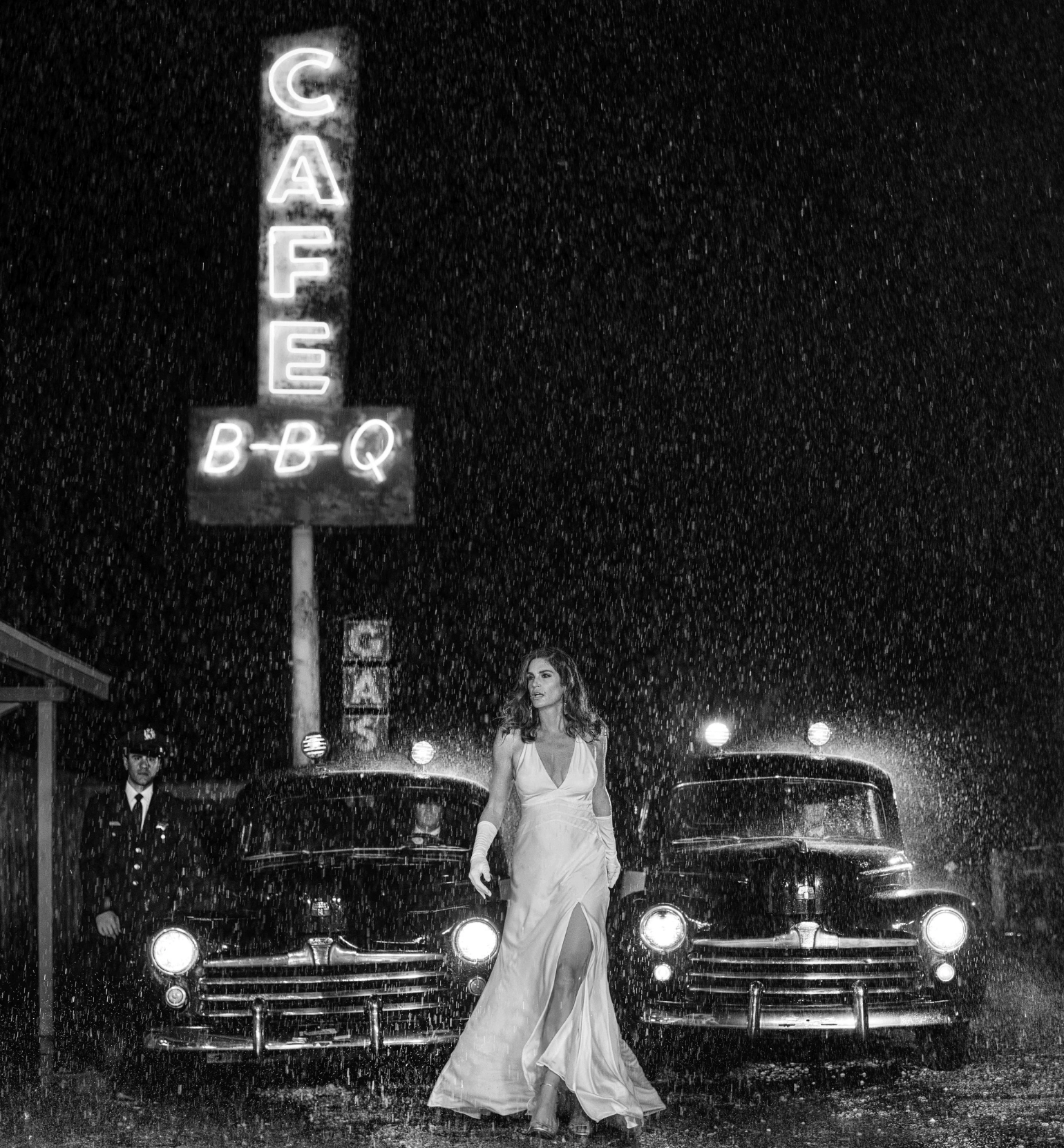 My preconception was to use the panel lighting to showcase Cindy in an intense rain storm. The rain would pop much more than it would do in daylight. I could see the potential of the concept; the set, complete with 1950s LA cop cars, was authentic and all the angles worked. There was an intended nod to the wonderful movie - LA Confidential - but the problem was that her period evening glam look would be immediately vulnerable to the rain.