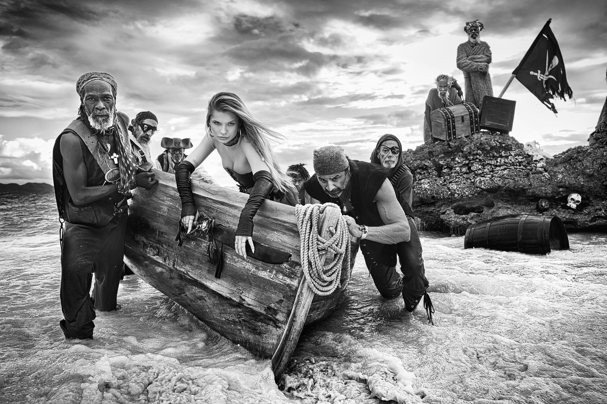 The goal was to attain compositional harmony amidst the chaos of the beach landing, which was not that easy an objective as this landing was for real. This raw and rocky coastline in Anguilla is no studio. In retrospect it is remarkable that not only are the faces of the six male pirates in the landing party all in view but they also show collective endeavour. They had enough to think about dealing with the boat in the tide and maybe the truth is that they weren’t in role at all.