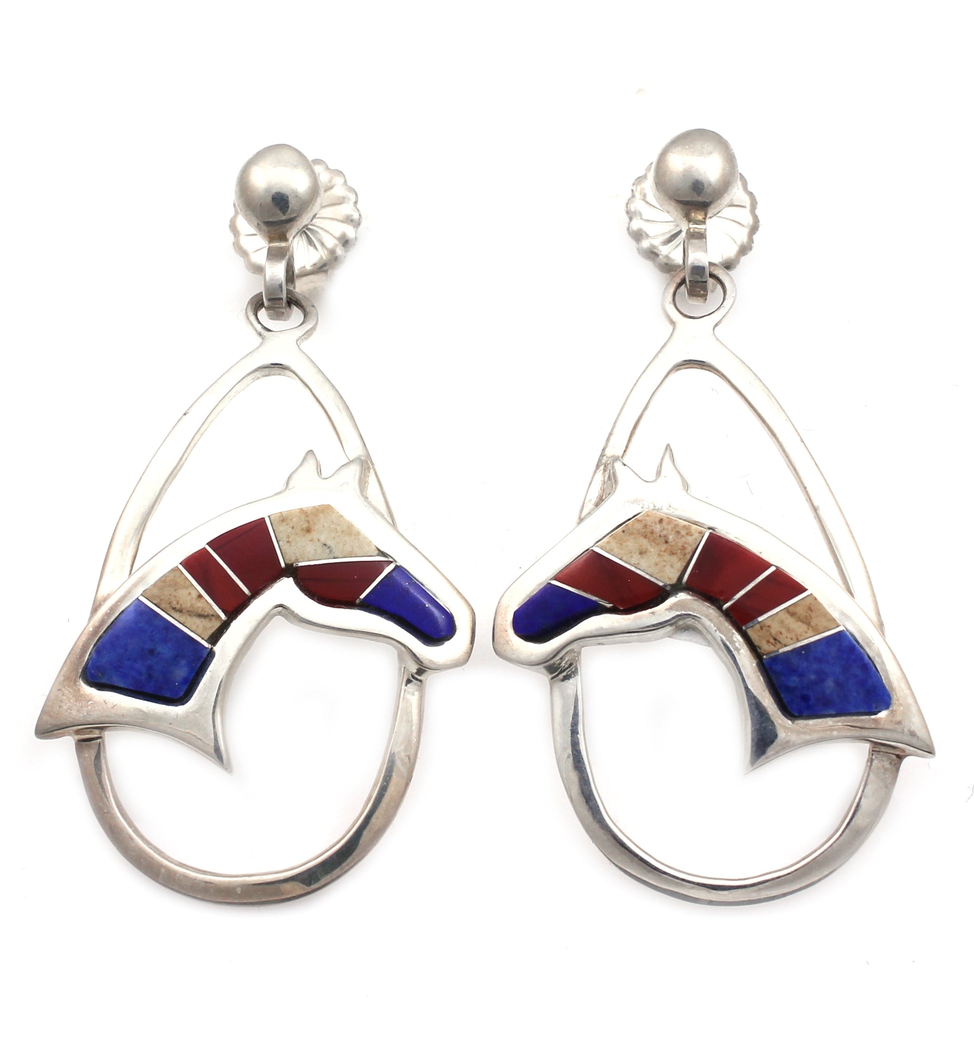 Sterling silver with blue stone and jasper. 2" long, post backing