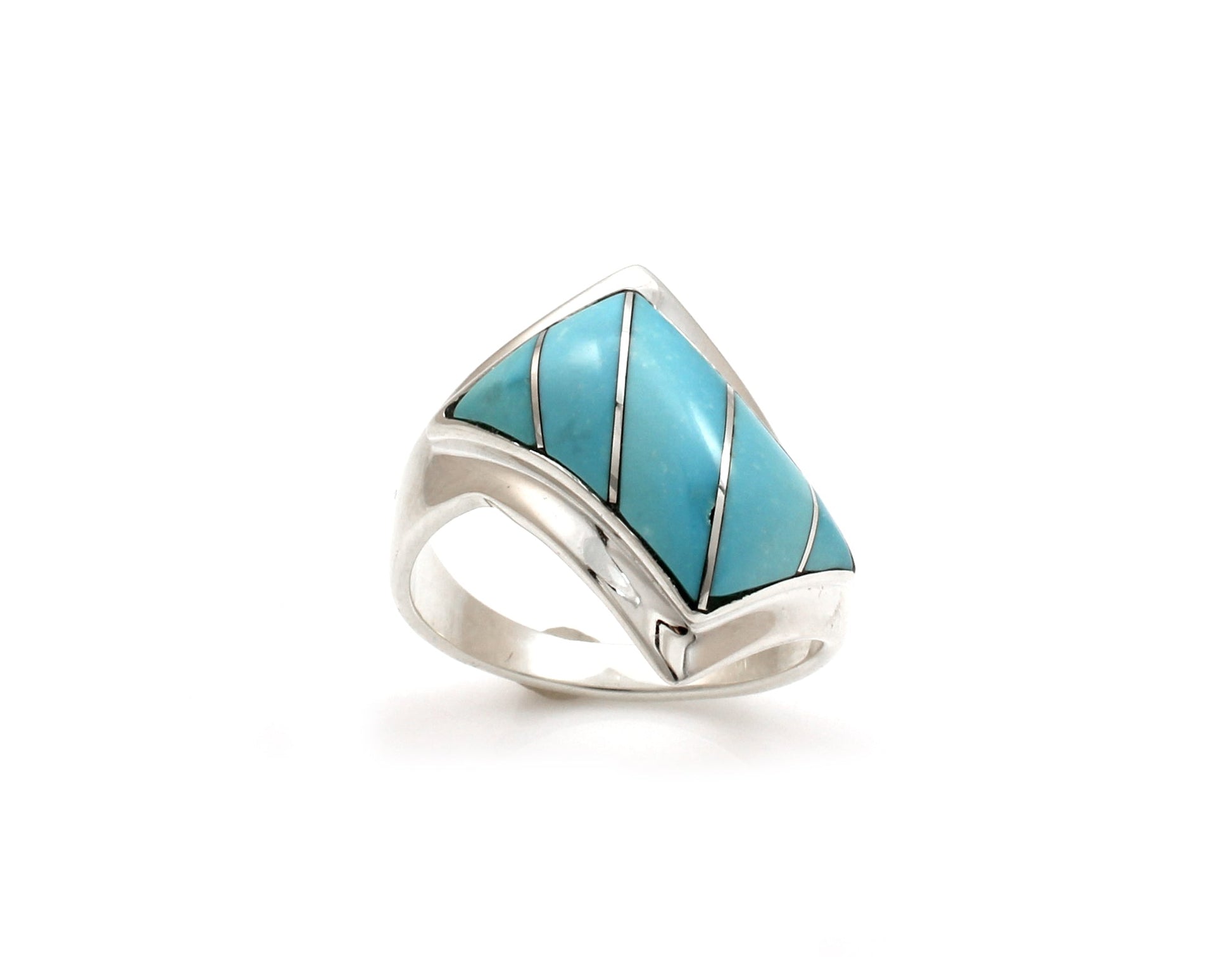 A modern western classic, Ben Nighthorse’s Lightning Ring is Sterling Silver with inlaid Turquoise.
