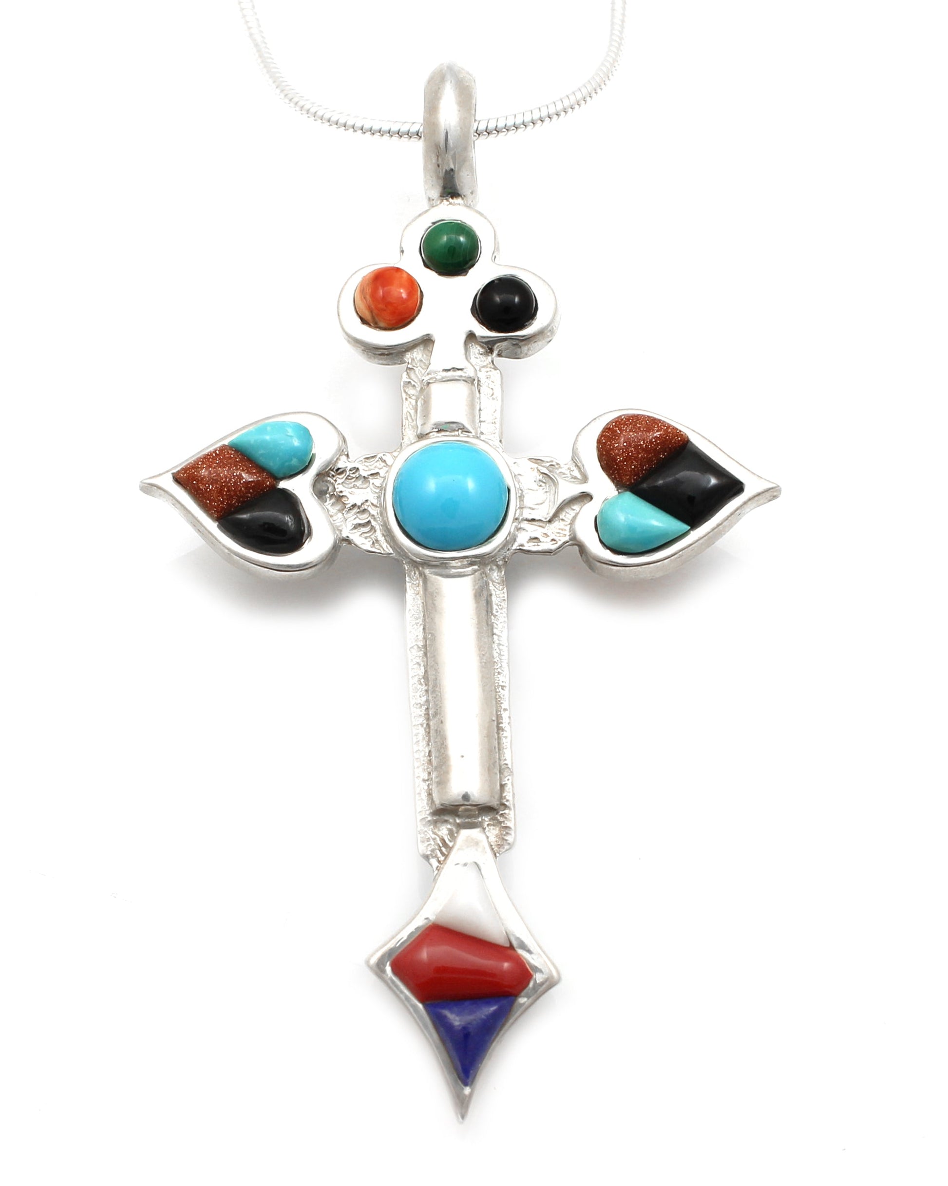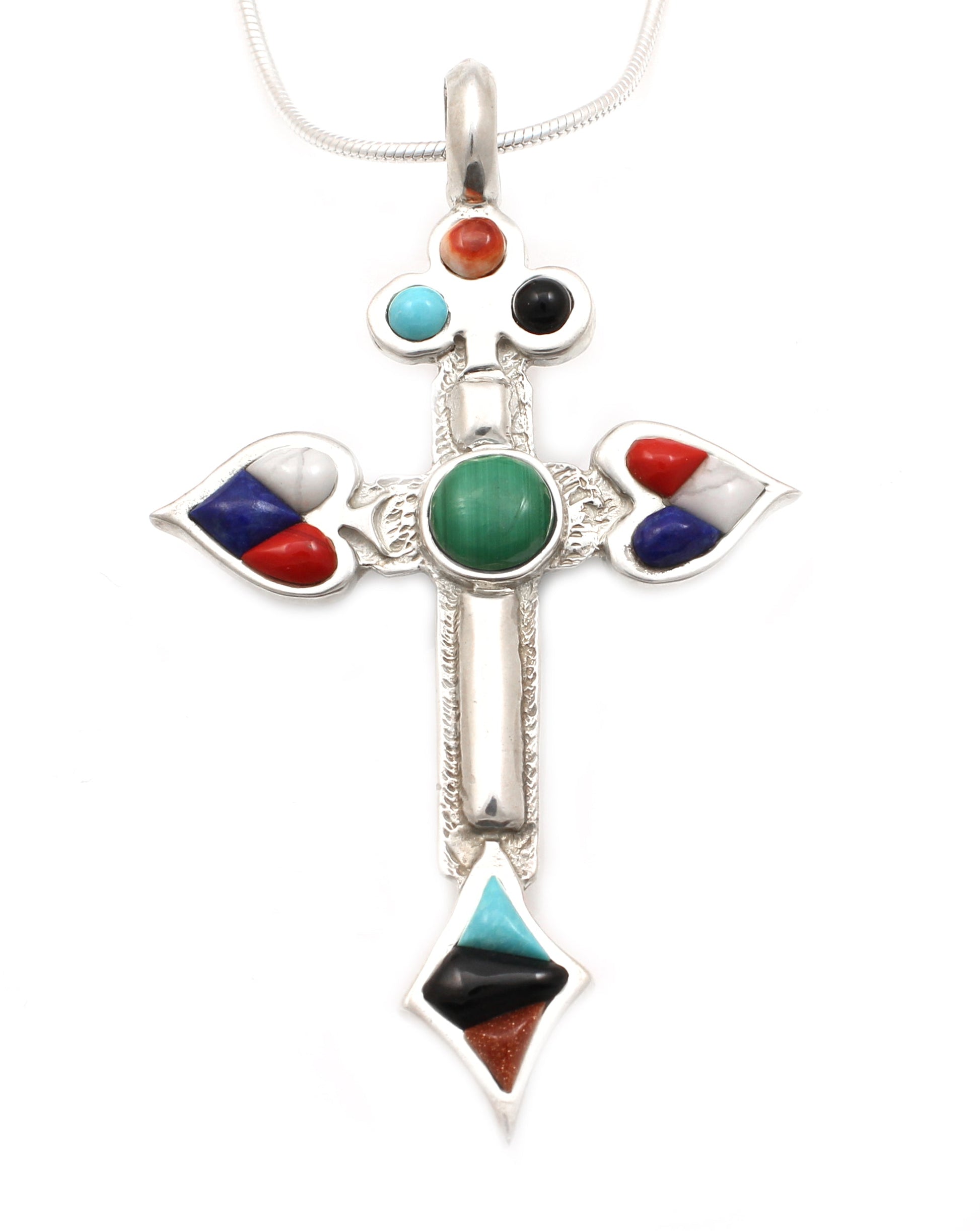 Sterling silver with malachite, roserita, white stone lapis, spiny oyster, onyx, turquoise. 2 3/4” x 1 1/2”, 18” chain included.
