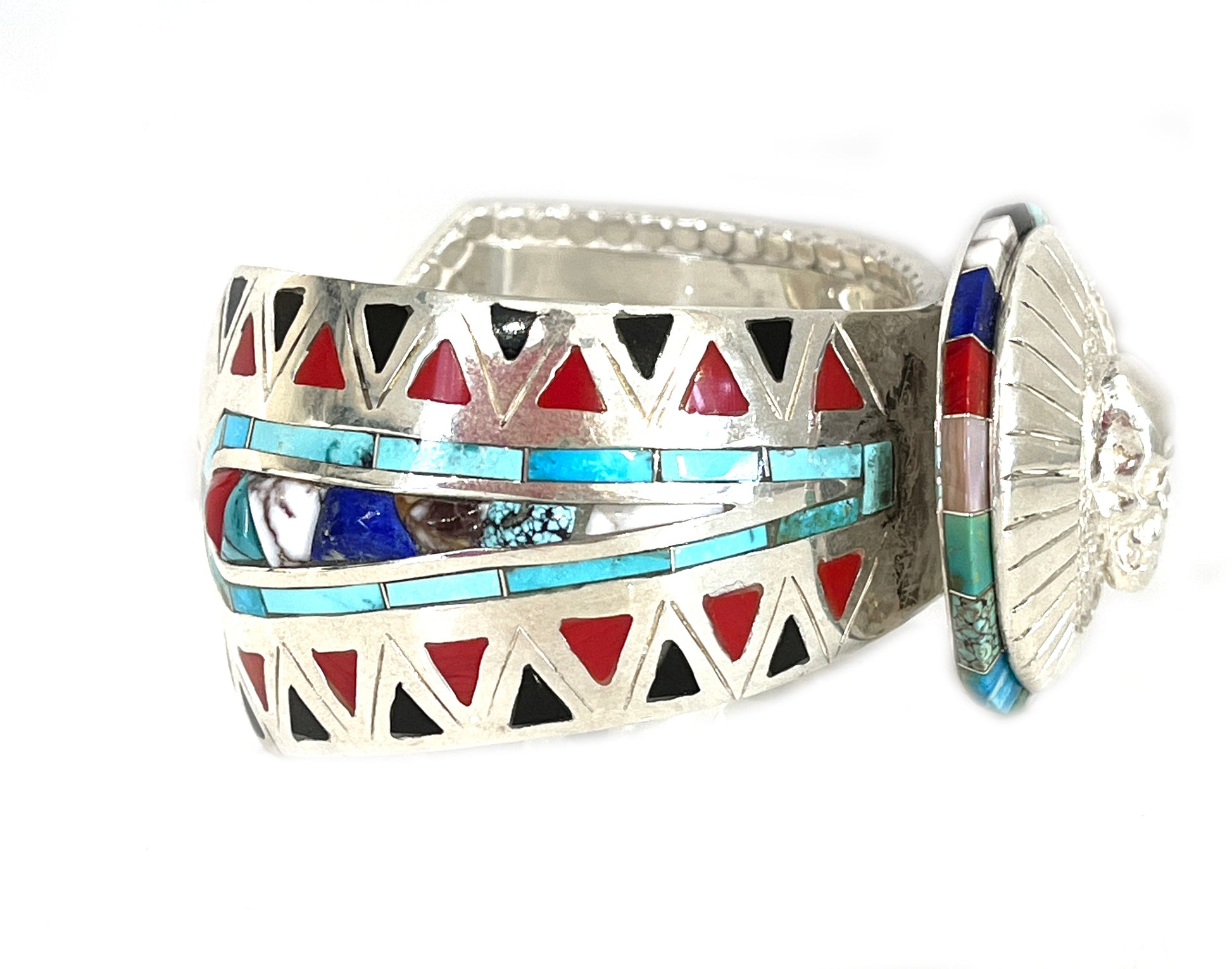 Sterling silver with rosarita, turquoise, onyx, lapis, wild horse and pink shell. 1 1/2" wide, size 7