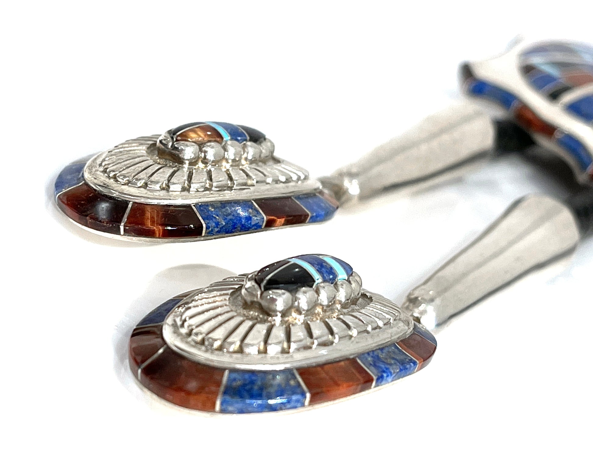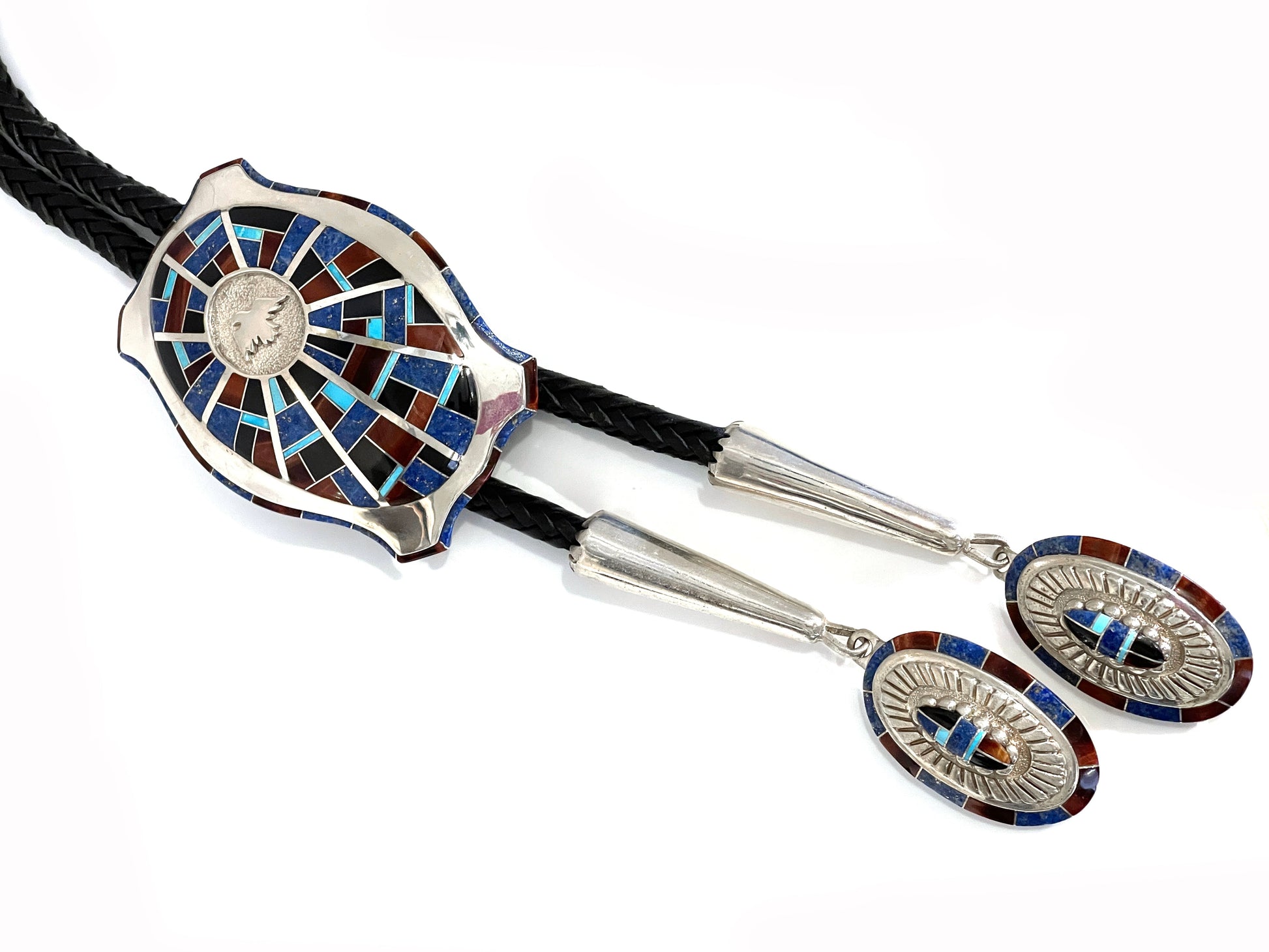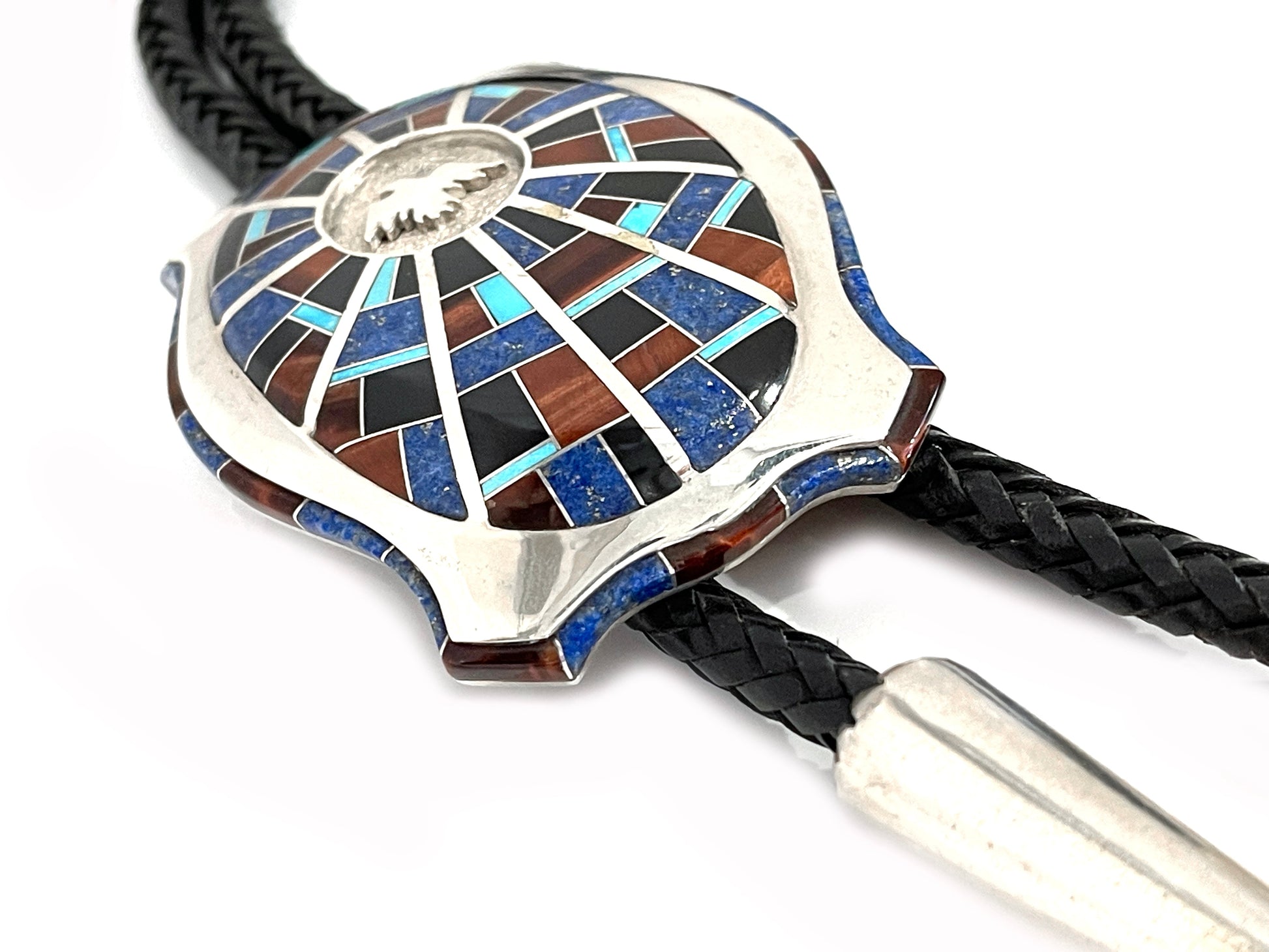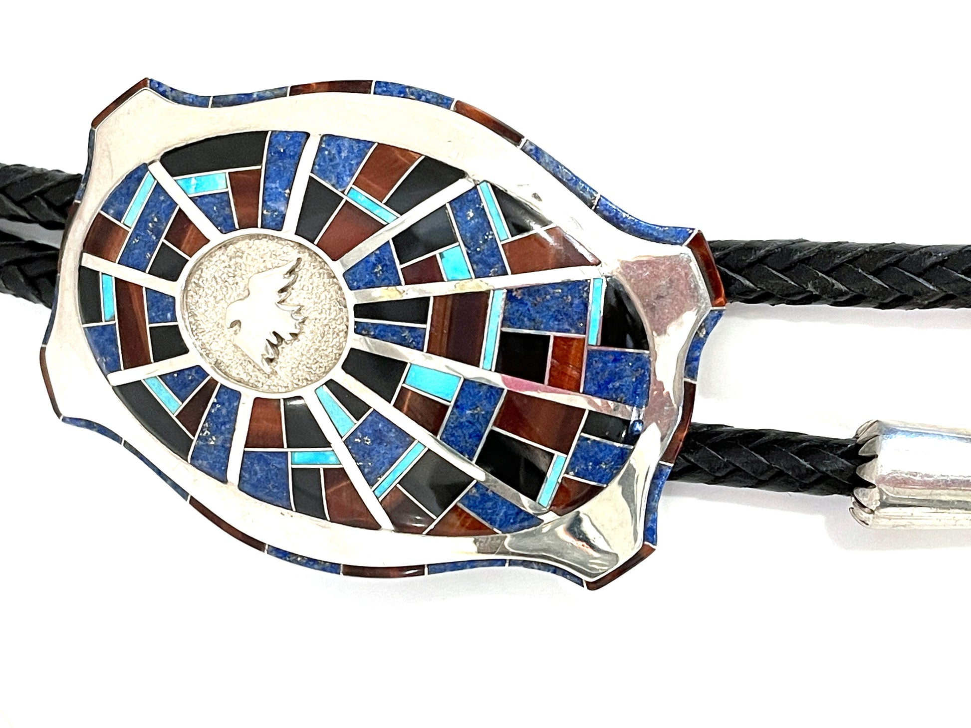 Sterling silver with denim lapis, turquoise tiger eye and onyx. 42" leather cord 3 1/2" x 2 1/2"