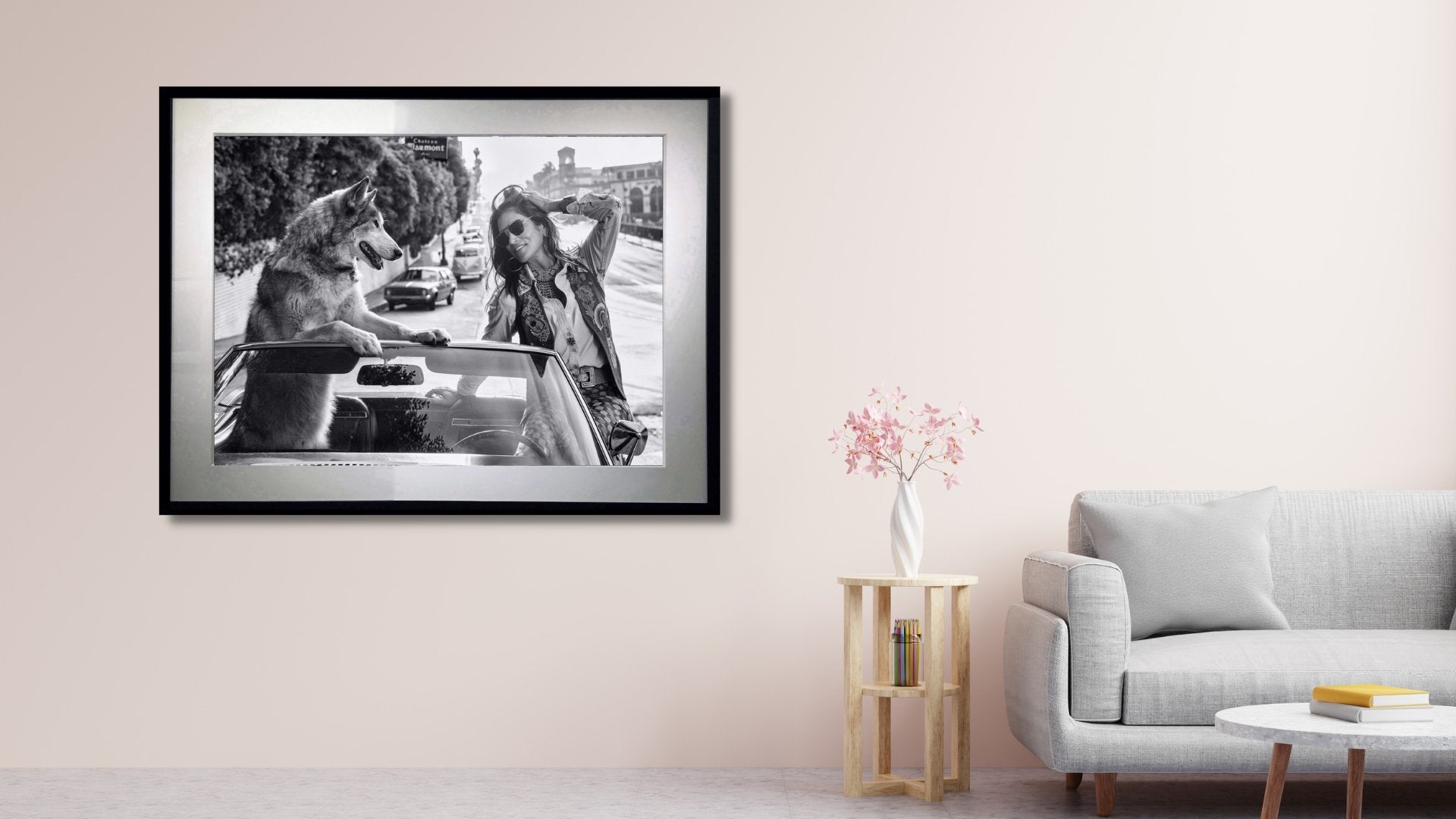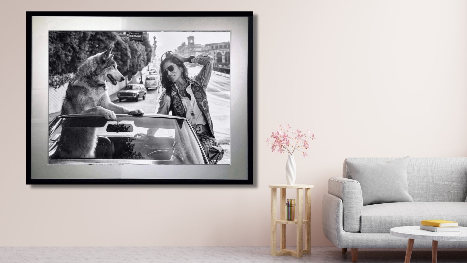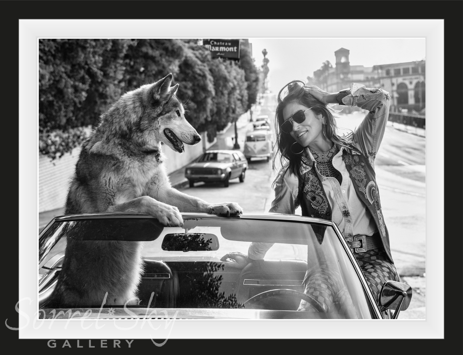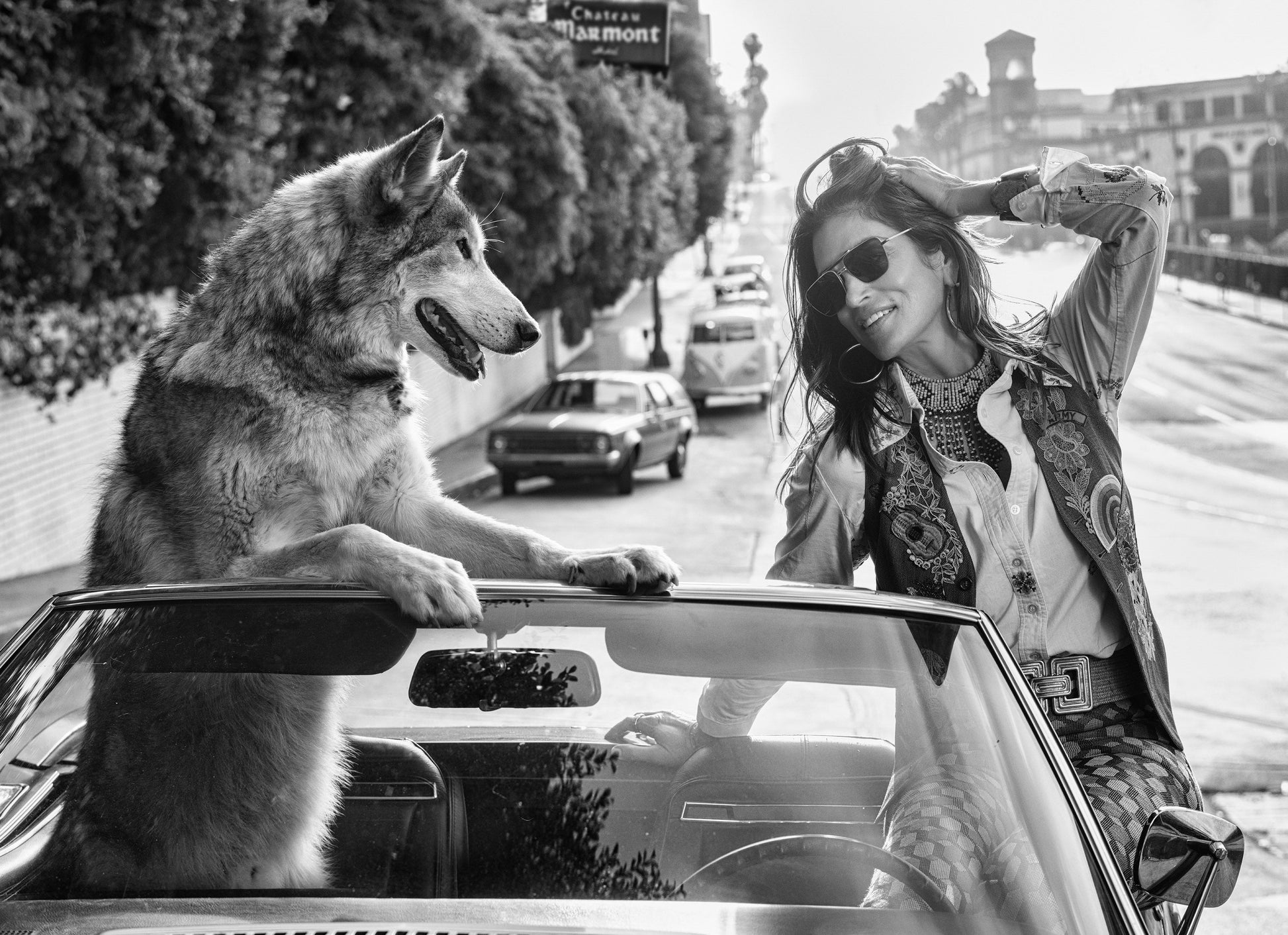 This mid 70s styled picture, featuring the iconic Cindy Crawford, is a Chateau Marmont parable with a wry twist. In the UK we have many numbers of pubs called “The Fox and Hound” and here, arriving at the hotel entrance in LA, is the ultimate “Fox” - Cindy, with the most excited of hounds.