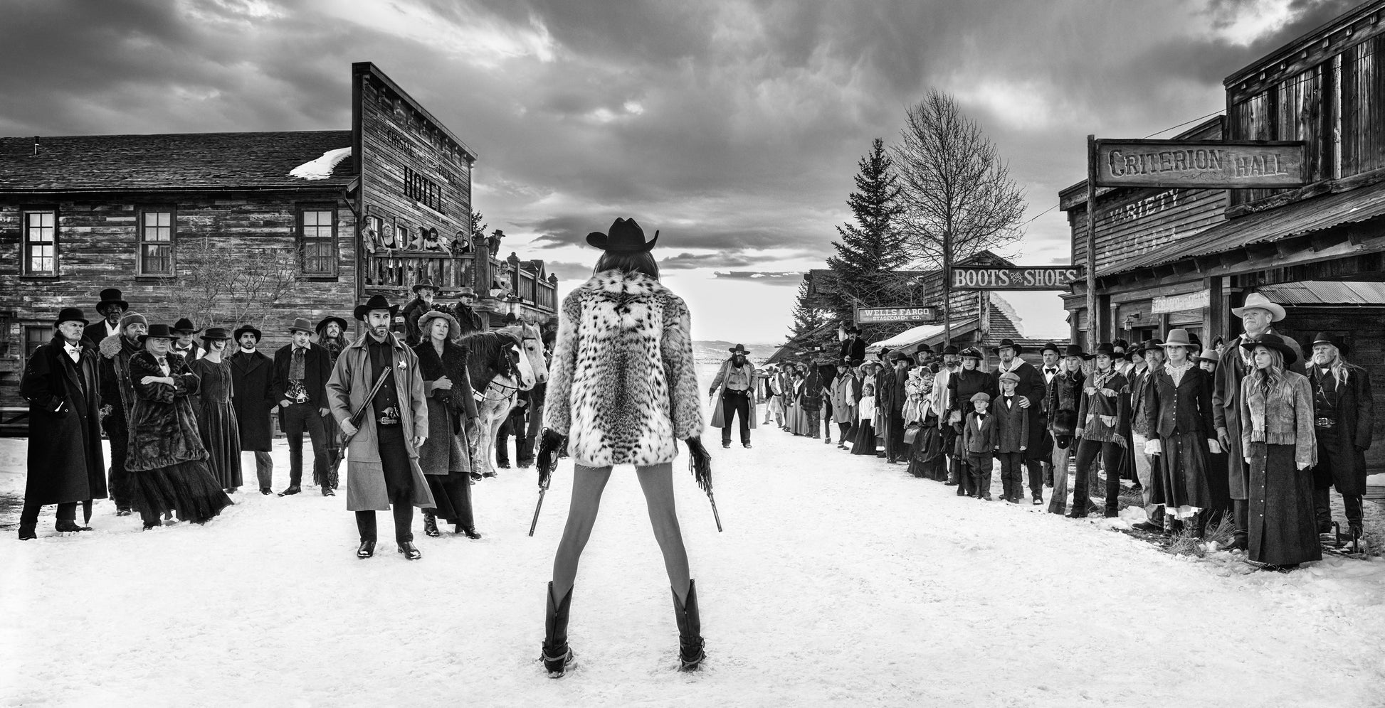 - about 120 all in. The logistics in the cold are challenging and then the execution of the idea requires precision as I want to see as many faces as possible and I want those faces to have a collective attitude. It seemed necessary to have women and children in the scene as if the whole town was watching the shoot out - this would not be a male dominated western vignette.